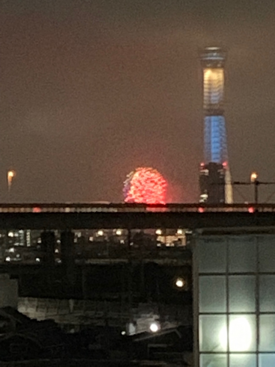 人混みが嫌で新小岩のマンションのベランダから見物しました。