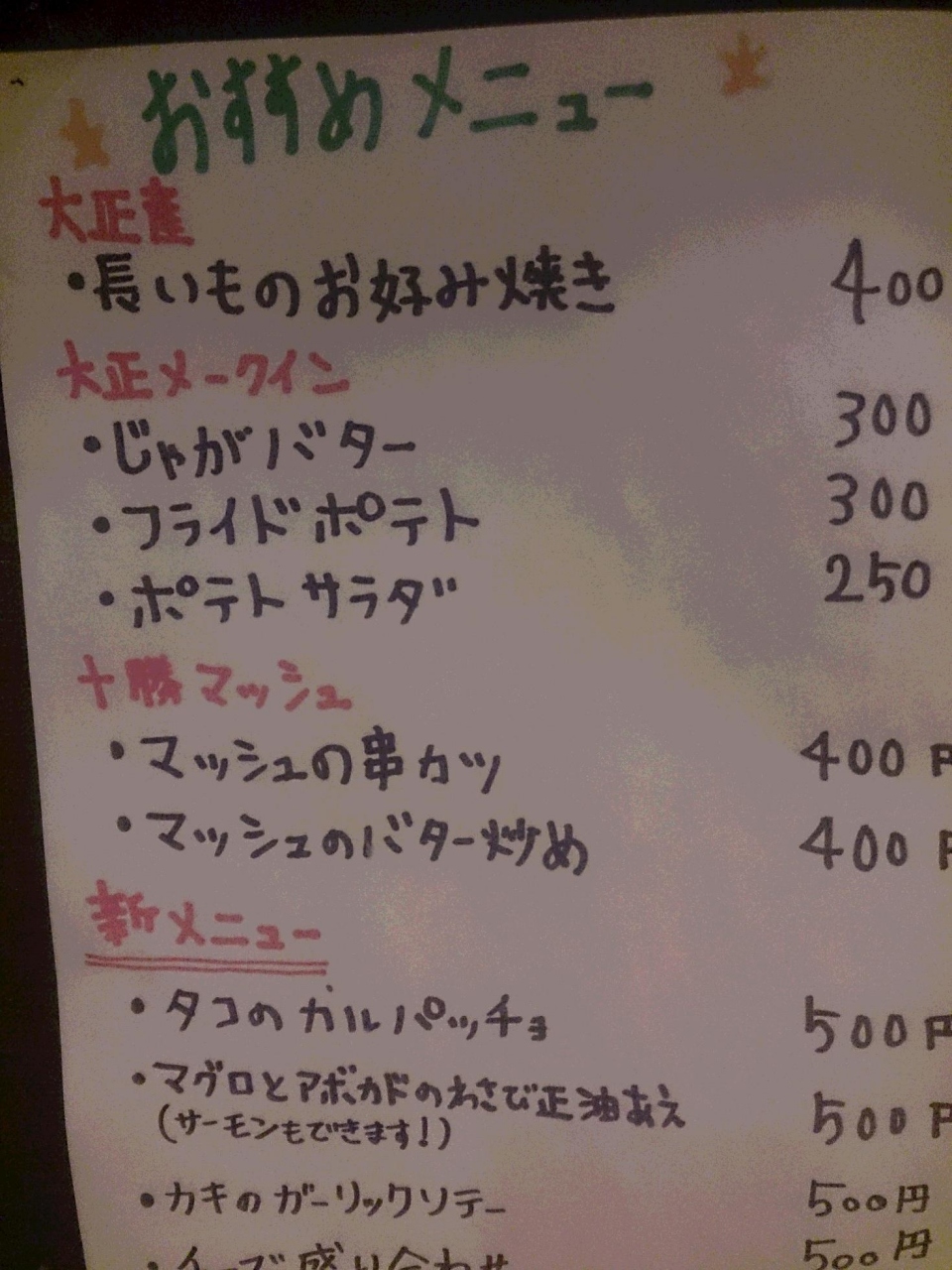 帯広に来たら、おいしい野菜が食べたいですよね。そこでおすすめが、このお店です。オーナーは、農家。正真正銘の「大地の商人」です。ここは野菜を中心としたナガイモのお好み焼やタマネギのスライス、そしてポテトサラダが大好きです。春にもかかわらず、いろんな野菜が食べられ十勝の大地に感謝です。