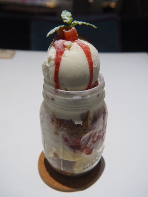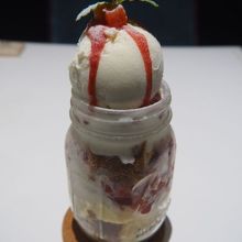 ガラスジャーに、ショートケーキ生地、ラズベリー、バニラアイス、ベリーソースをたっぷり詰め込んで、更に蓋をする様にバニラアイスをもう1スクープ盛っている。