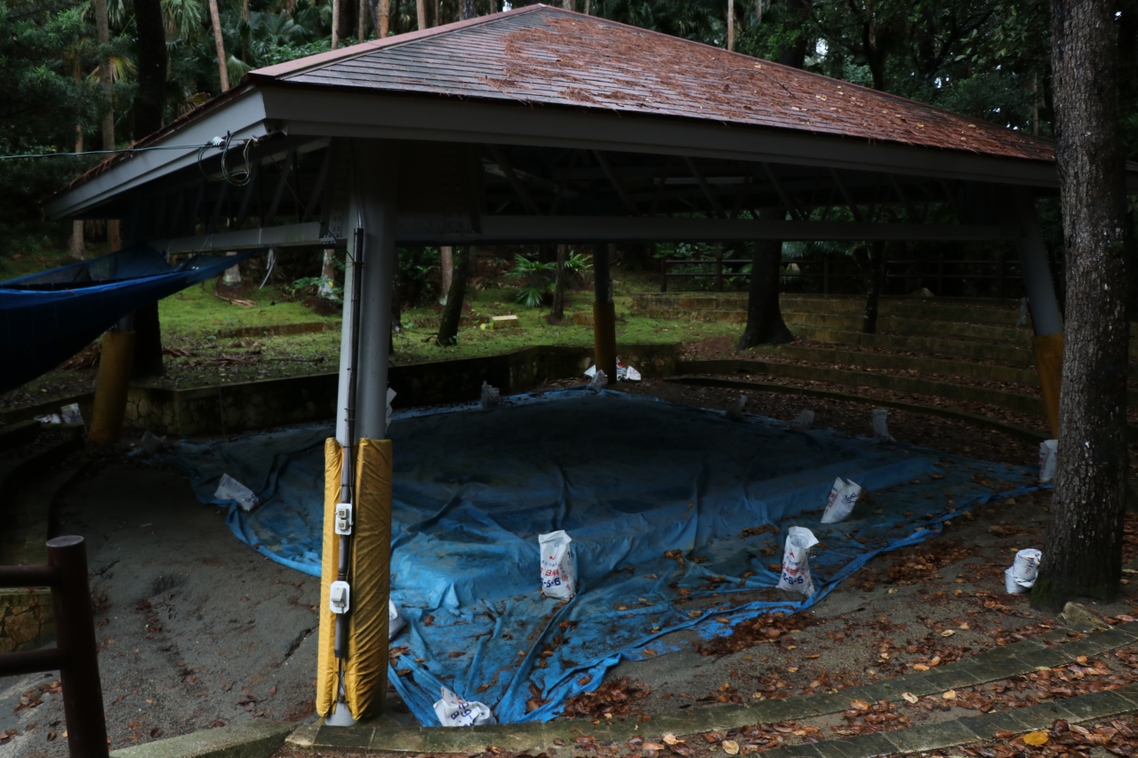 島の中心部から西港に向かう途中の道を脇にそれると駐車場があります。神社自体が杜の中にある上に天気が悪かったのでちょっと不気味な雰囲気に・・・ 鳥居の横には大東相撲で使われる土俵と観客席があり、普段は閑散としている神社も取組の日には大ックの人で賑わうのでしょうか。