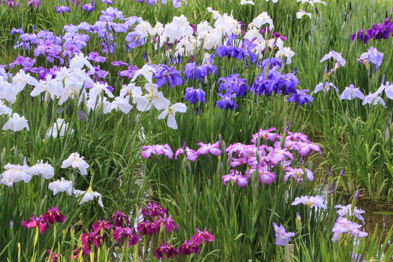 皇居東御苑の二の丸庭園にある菖蒲田はそれほど広くはありませんが、花菖蒲が密集しているので見応えがありました。また、菖蒲田を一回りできるように散策路があり、色々な角度から色とりどりの花菖蒲観賞できるようになっている点も良かったです。