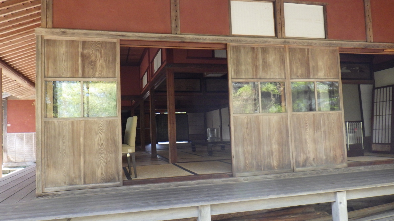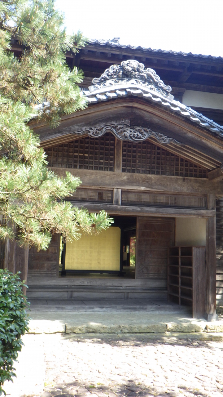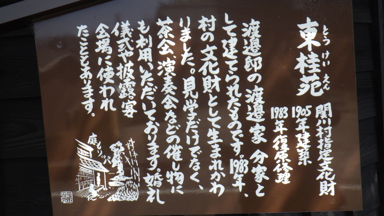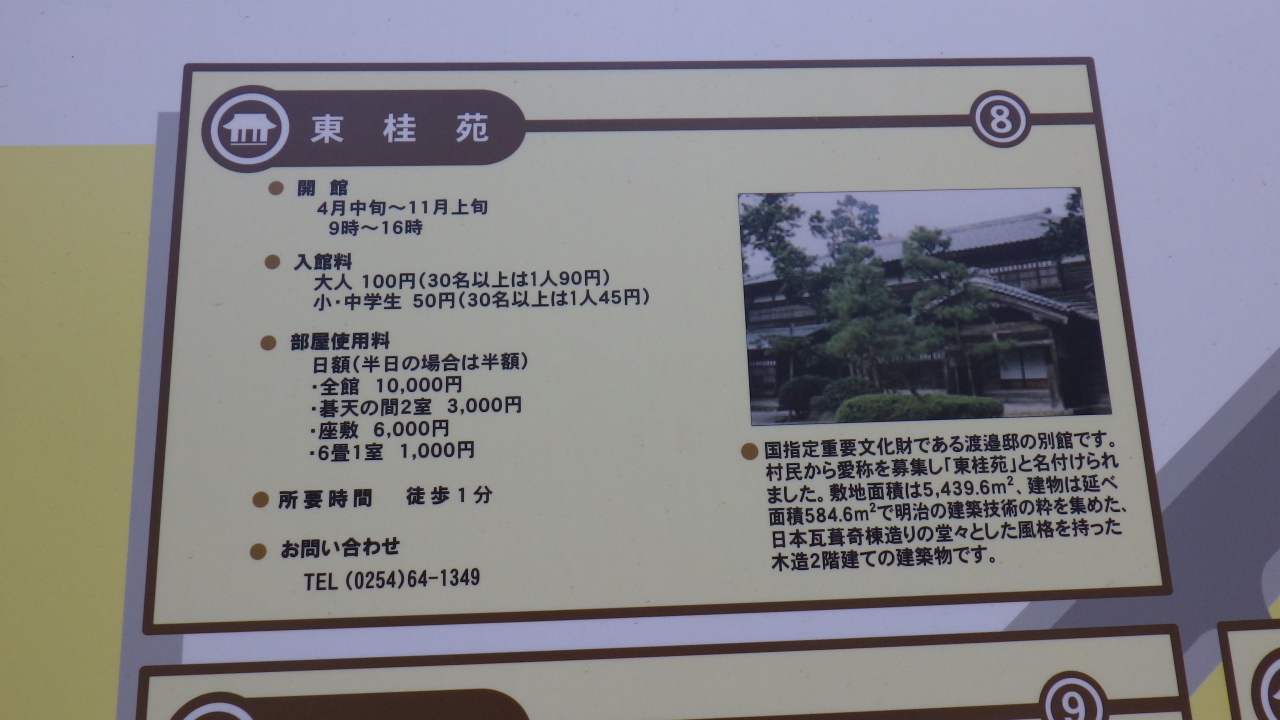 案内板によると、関川村指定文化財江戸時代の豪商濃大庄屋渡邉家の別館で、敷地面積5,439.6㎡建物延べ面積584.6㎡で明治時代の建築技術の粋を集めた日本瓦葺奇棟造り木造2階建ての1905年建築の建造物と、座りながら庭を眺望された庭園のがあり、現在見学だけでなく婚礼儀式や披露宴会場としても使う事の出来る村が管理する施設で、入館料100円とリーズナブルとてもお勧めのスポットです。