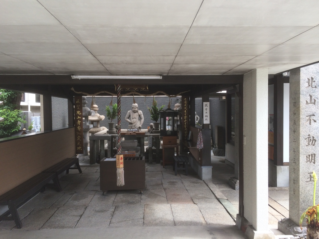 大通り沿いにあり、裏道からも入ることが出来ます。奥がお墓で道路沿いには塚がいくつかありました。境内は壁に囲まれています。北山不動明王があり、屋根がありお参りしている人が幾人かいました。境内は平屋のような横長の建物で以外と見どころがありました。