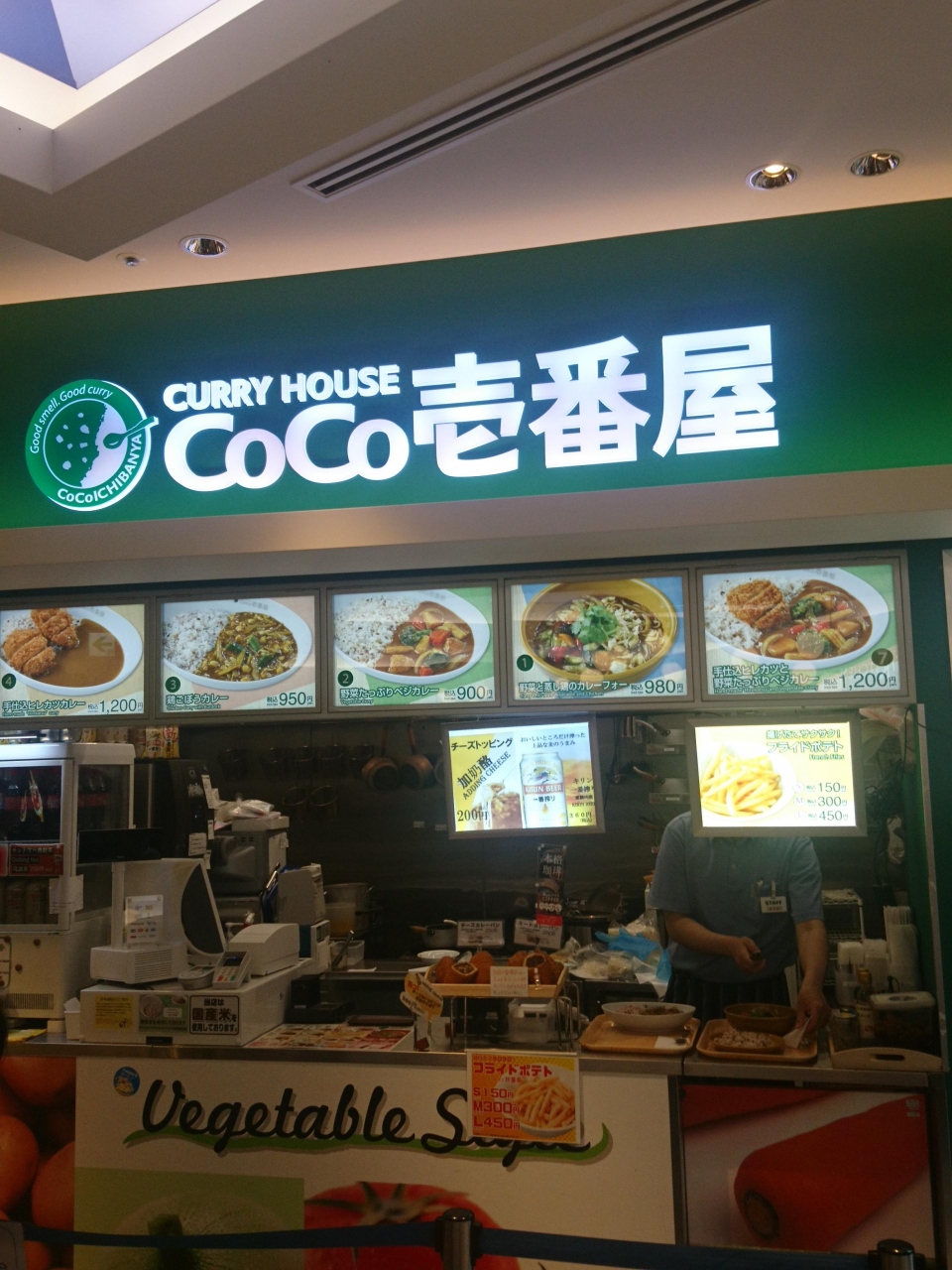 中部国際空港(セントレア)のターミナルビル4階のフードコート内にあるカレーチェーンココ壱番屋の店。トレードマークの黄色の看板ではなく緑色の看板を不思議に思ったら、この店はこのだけの限定メニューの特別な店ということらしい。