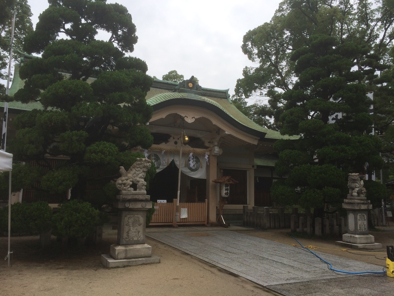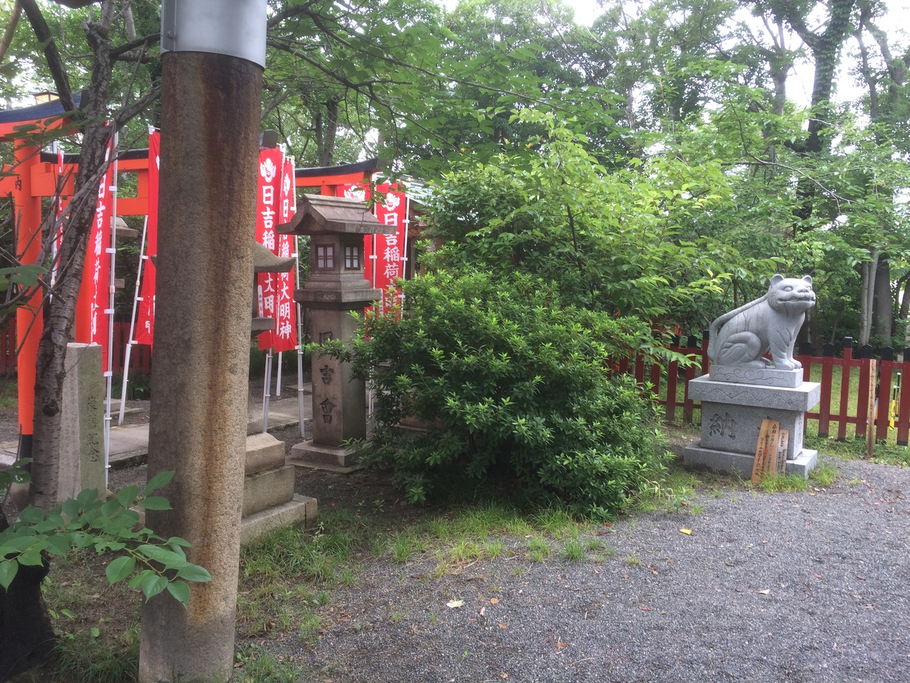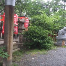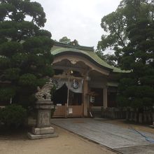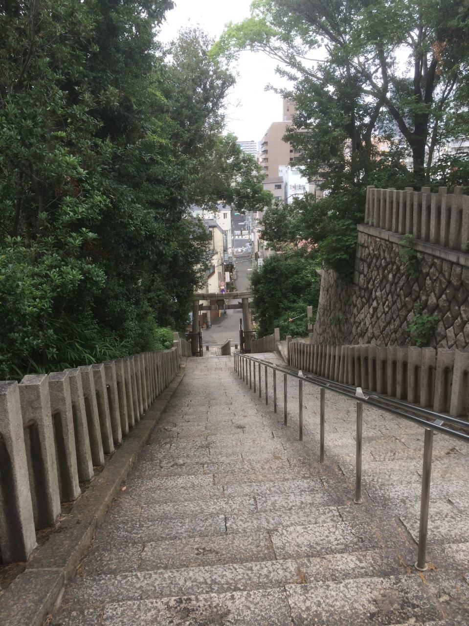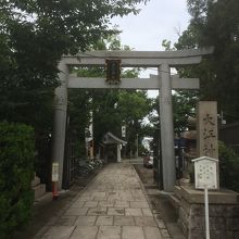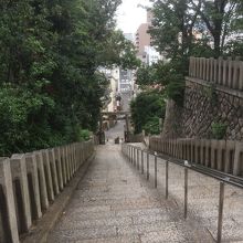 大通り沿いを曲がり裏通りにある穴場の神社で鳥居の横には坂がありました。鳥居を潜ると境内の中央は空間があり社殿等は境内の端にあります。境内の中に小さな赤い神社もありました。奥になると反対側の出口で急な階段になっていて高い台にあるので天王寺方面のビル群を望むことが出来ます。