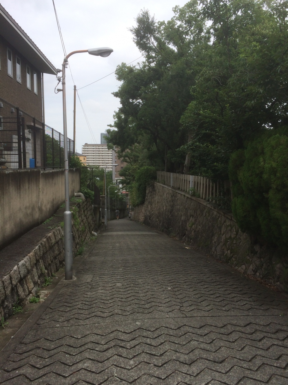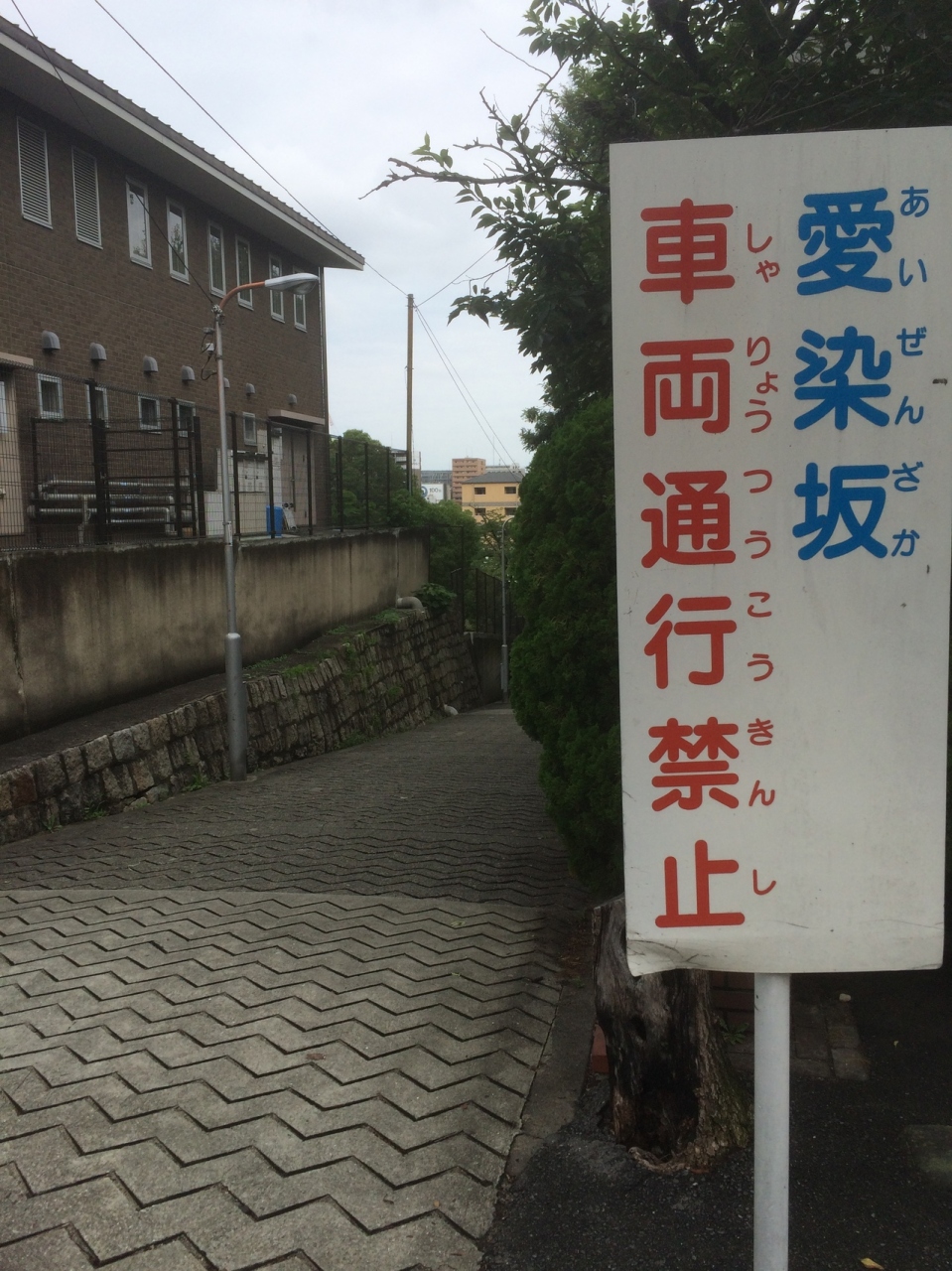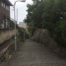 愛染堂に隣接して大江神社があり、神社の横から坂になっています。横には坂の看板もありました。上からと下からと両方行き来しましたが思ったほど楽に歩けました。地元民が多く利用していて自転車の人も多かったです。坂沿いには下部にお寺もありました。