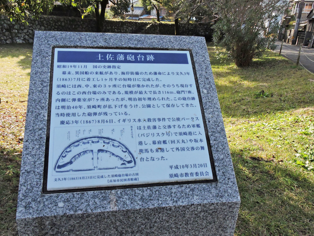 園内の石垣が台場の遺構で、国指定の史跡となっています。「土佐藩砲台跡」を簡略に紹介する解説板がありました。