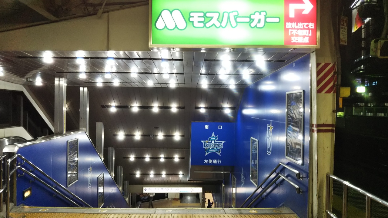 関内駅最寄りの横浜スタジアムでナイトゲームが開催されるということで、ホームから改札口に降りる階段がきれいにライトアップされていました。通常の1.5倍から2倍くらいの明るさでした。2019年のシーズンが後半になりベイスターズが上り調子なこともあり、応援しているのかもしれません。
