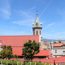 八幡坂の上の道沿いに少し歩くと教会が点在する地区があり、最初に目に入ってくるのがこの教会の尖塔と赤い屋根です。