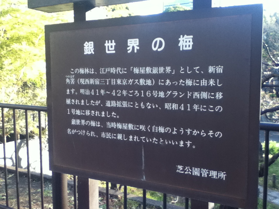 銀世界の梅は芝東照宮の横、芝公園内にある梅林である。数人が見ていた。お勧めの点は、江戸時代、梅屋敷銀世界として新宿角筈にあった梅に由来していること、その後、他の処への移転を経て昭和41年現在の地に移されたこと、現在の処には約70本の梅林があること、梅の開花時期には綺麗な梅の花が咲き見れることである。訪問時の感想は、まだ梅の花は咲いていないが、梅の木々が並び周辺の小高い丘とともに素敵な景色が広がり癒された。訪問して良かった。