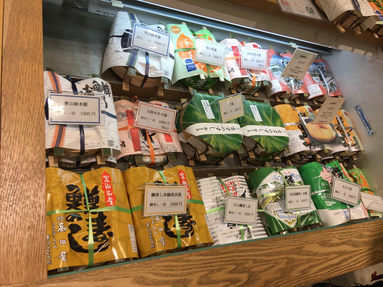 富山に来たら必ず寄るお土産屋さん&飲食店の集まりです。中の飲食店も寿司、ブラックラーメン、白エビ屋さんなど一通りこちらに集約されています。個人的には、ホタルイカの干物が好きですが、好きすぎてやめられなくなり気持ち悪くなったことがあるので、おさえました。家族から鱒の押し寿司のリクエストがあり、こちらには、代表的なものは、揃っています。我家は、レアっぽいのがすぎて、中野屋さんのと銘柄は、決まっています!