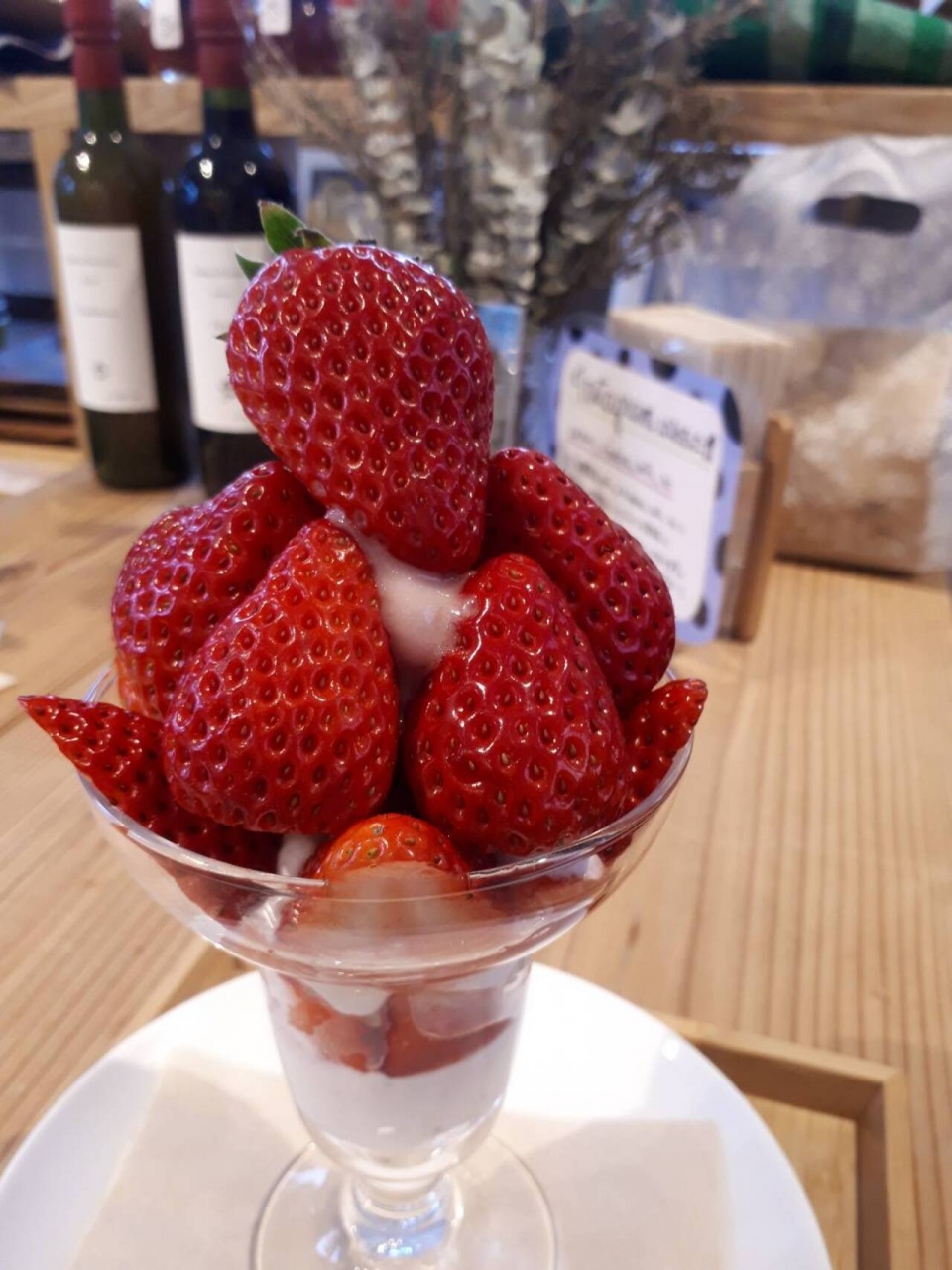 いちごパフェを食べました。主人とシェアしました。いちごがこれでもかというほど盛られており、敷き詰められています。