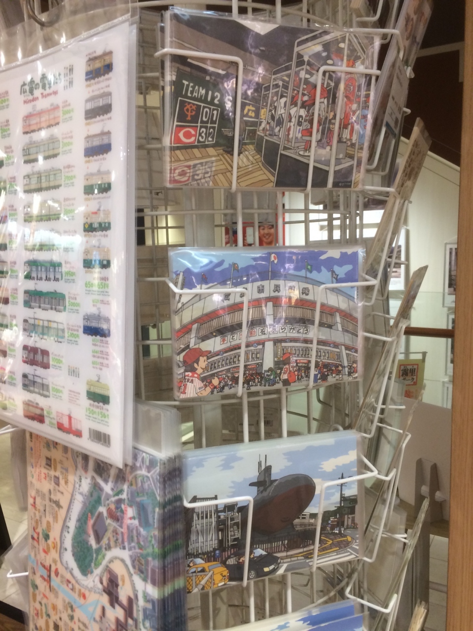 1Fは広島県内の物産品がたくさん置いてあり生ものも販売していました。広島カープのパッケージのもみじまんじゅうを買いました。2階に行くと広島カープに関するグッズがたくさん売っていて赤一色でした。お好み焼き屋もありましたが1,400円ぐらいと少し高めの値段設定でした。