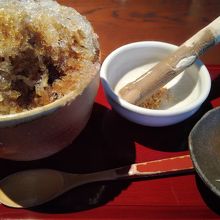 近江八幡日牟禮ヴィレッジ内にある、たねや日牟禮茶屋。たねやの美味しいスイーツを店内でまったり食べられるのはうれしい限り。おすすめはつぶら氷、抹茶味。抹茶の蜜と、小豆がたっぷり入ったかき氷です。つぶら餅は全てのかき氷に付いてきます。