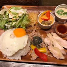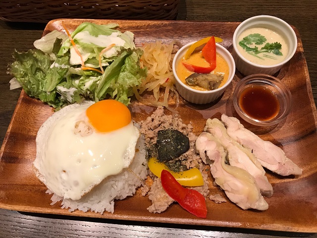 KUUセットだったかな、名前は不正確ですがサラダ、アジアンカレー2種類、ご飯、ガパオなどがワンプレートに乘ったセットがお得でした。ジョッキビールが+200円で付けられたのも◎良かったです。