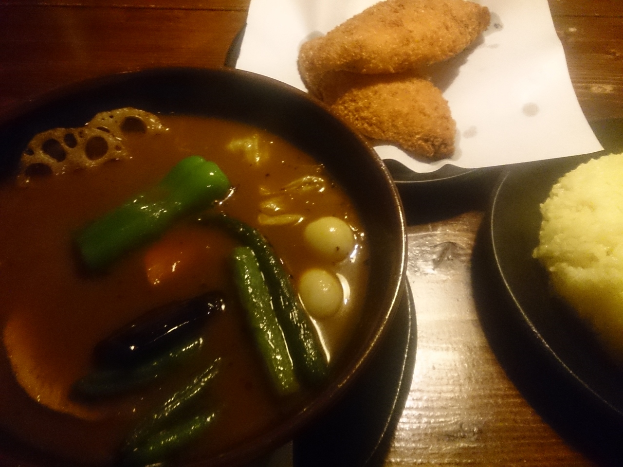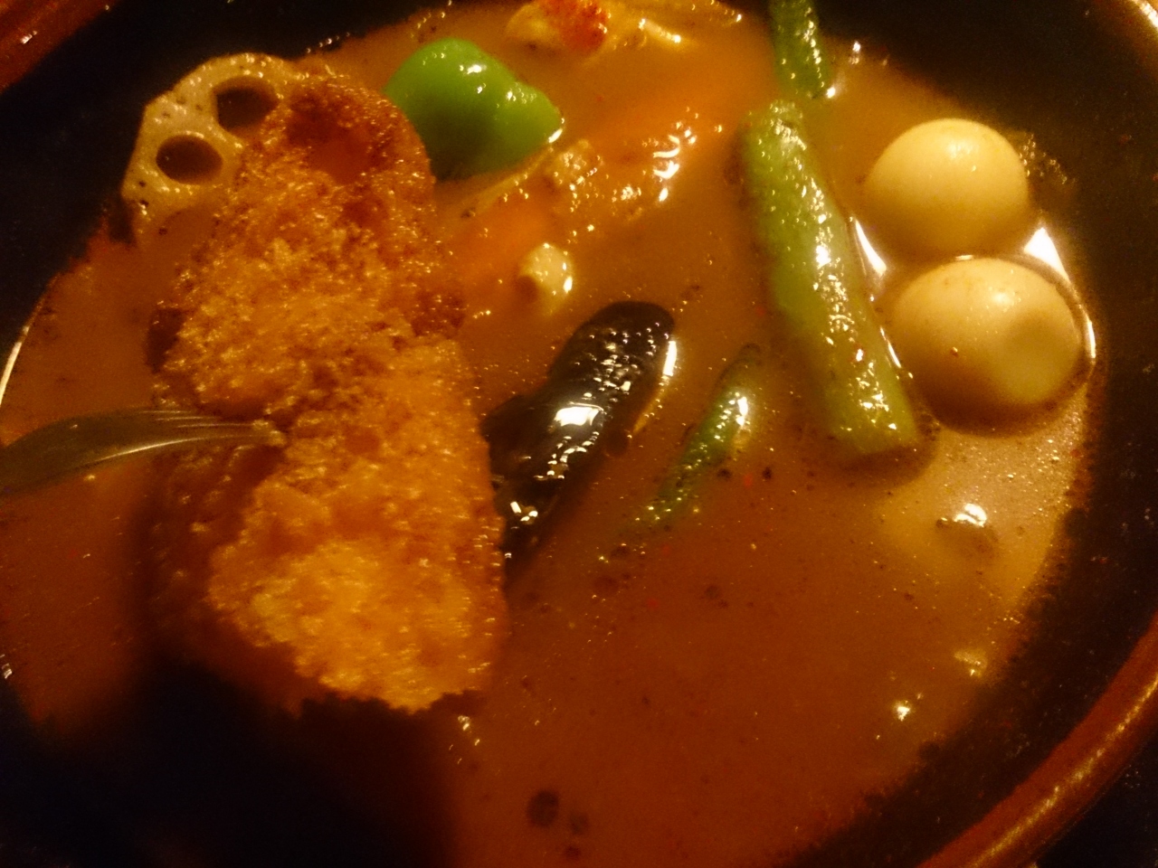 JR千歳駅に近いスープカレーのお店です。札幌に本店があり、苫小牧にもあります。いわばチェン店ですね。チェン店ですが、札幌のお店と同じ味で、濃厚なスープがおいしいです。この日は、フィッシュスライのを選びました。フライは、少し脂っぽいですが、カレーのスープが中和させてくれます。このお店は、新千歳空港まで、車で20分ほどかかるところにあるので、空港に行く人は、余裕をもっていくことが大切です。
