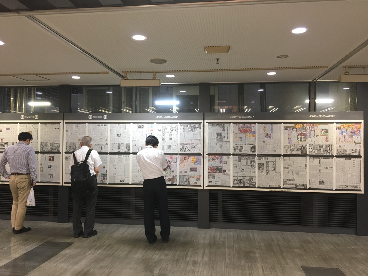 毎日新聞本社があるビルですから、同社の新聞がずらっと張り出されています。一般紙、スポーツ新聞、子供新聞までありました。サラリーマンの方たちが足を止めて読んでいます。昭和から令和まで、ずーっと変わらない光景なのかな、と思いました。
