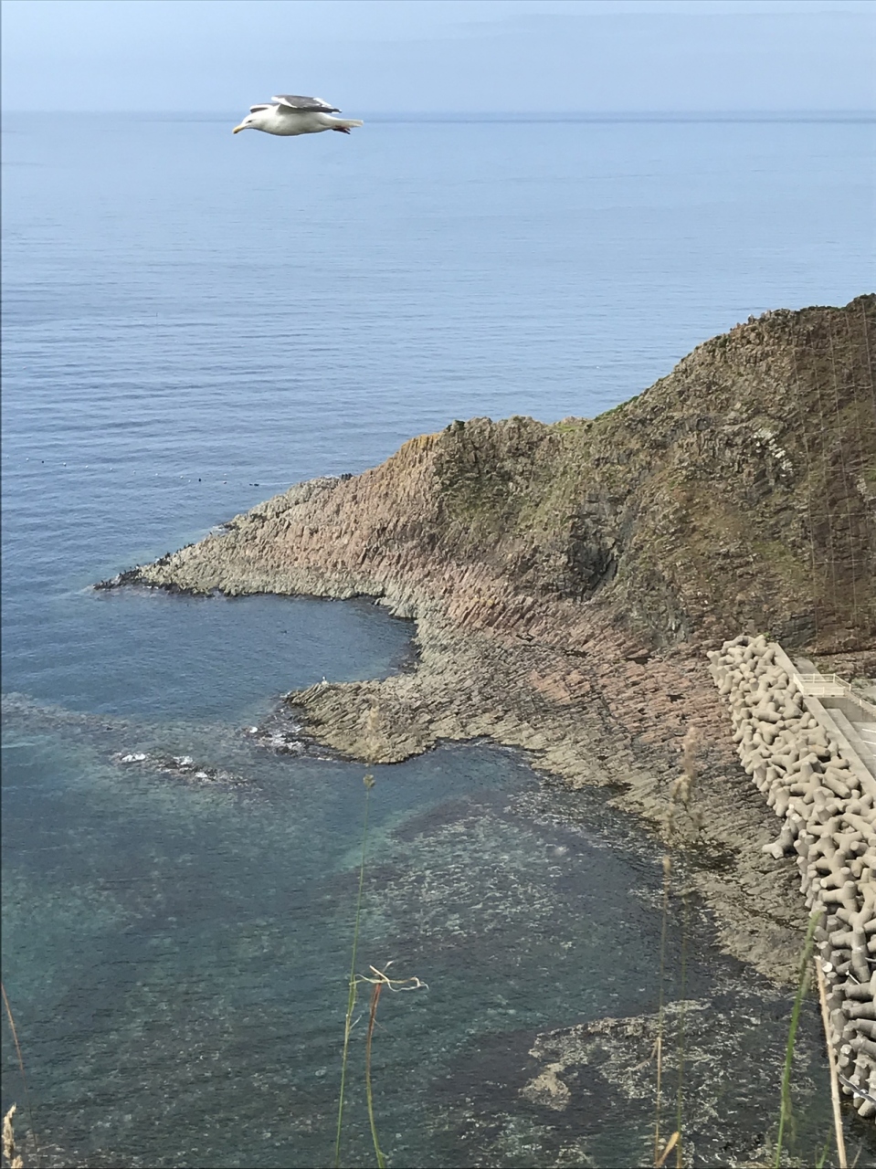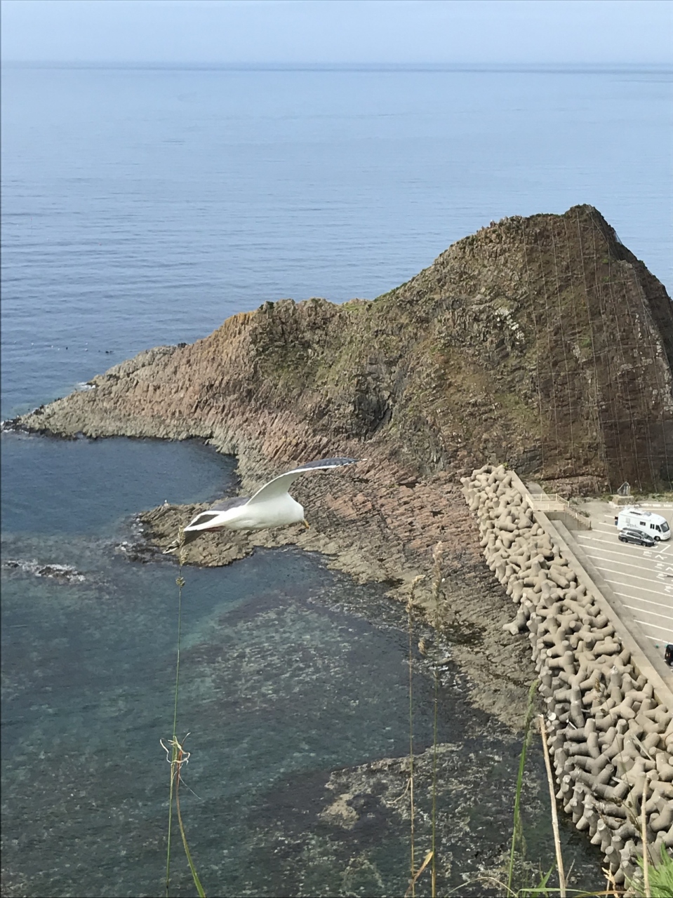 かもめがすぐそばと飛んでいて海はブルーで感動のひとことです。