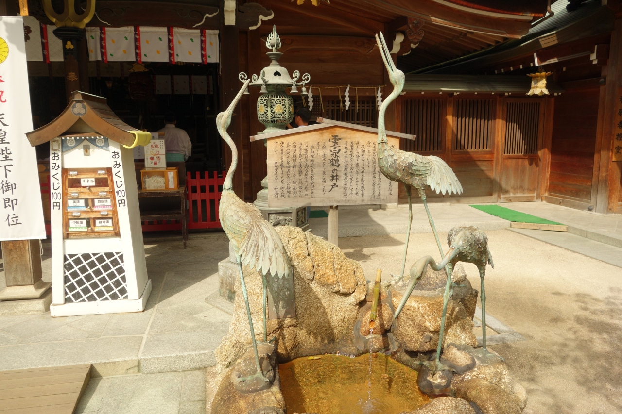 櫛田神社の社内にある井戸で、3羽の鶴の像に囲まれ守られているようなかたちとなっています。これは不老長寿の泉とも言われ、数年前まで実際に飲めたそうですが、今は残念ながら衛生上の理由で飲むことができません。仕方なく眺めて写真を撮っただけでした。