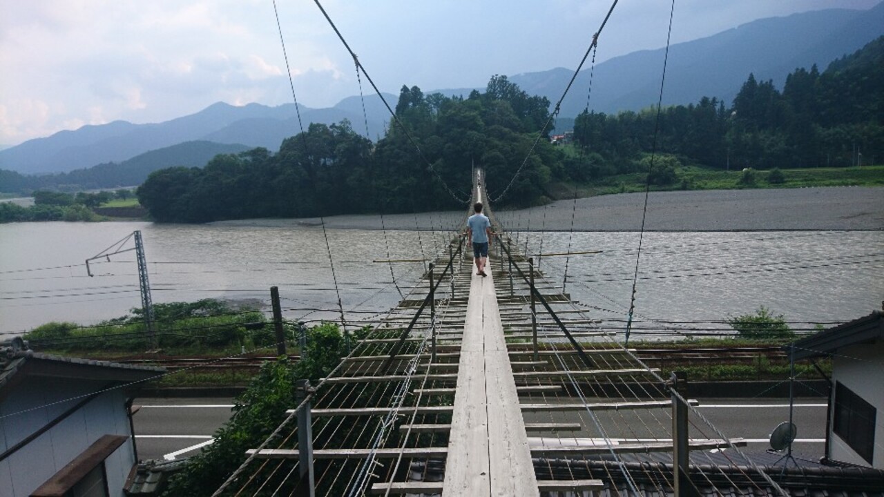 道路のすぐ脇なので、すぐに見つけられます。道路沿いに乗用車数台分の無料の駐車スペースあり。吊橋は人一人が歩ける幅の木の板の上を歩いて渡りますが、距離もあり、そこそこ揺れるので、ちょっとしたスリルを味わえます。途中途中、人がすれ違えるよう木の板の幅が広くなっています。