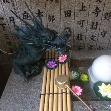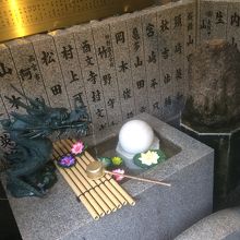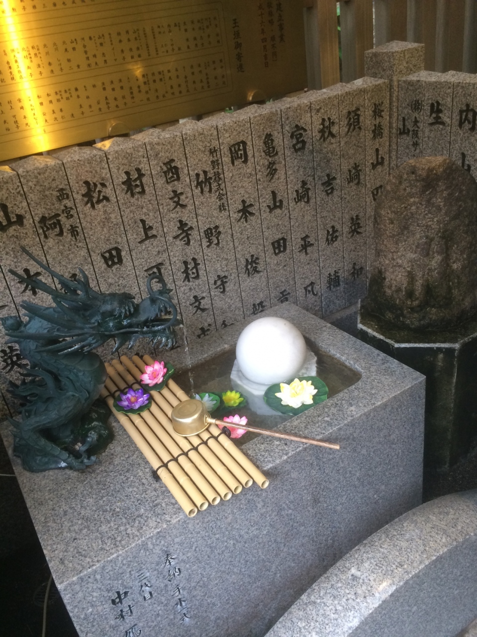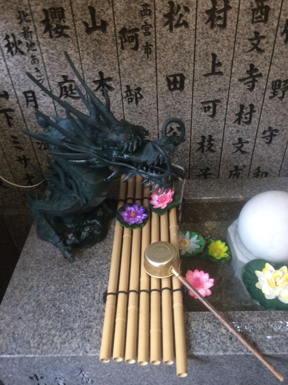 龍の口から水が出て、丸い石の直撃しているような感じで、水力で廻っています。造花の花が水の中にある涼し気な雰囲気でした。横には黒い台座の上に石がのっかっています。神社の手水場も兼ねれているのが手をすすいでいる人もいました。