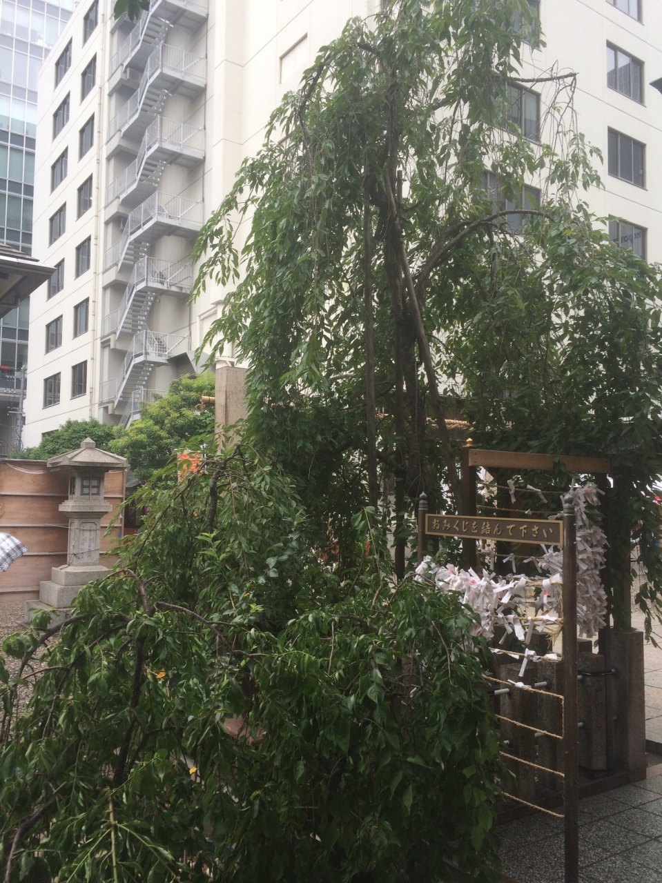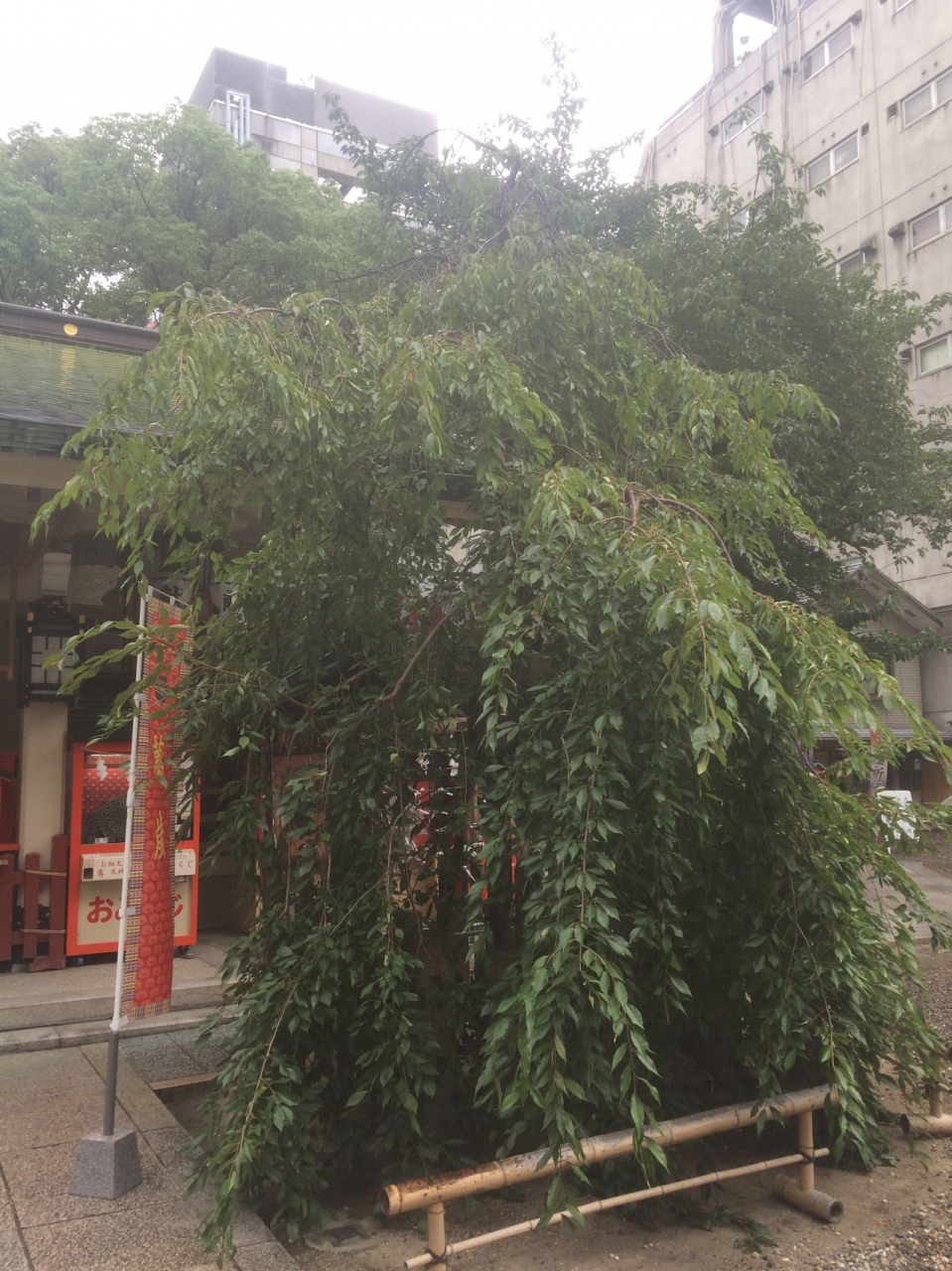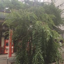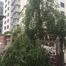 桜の季節ではないので、あまり目立たない木でした。木の近くに社殿など建物等があるせいかもしれません。しだれ桜なのか、緑の葉っぱが垂れ下がっていました。木の枝は細目で高さもそれほどでもなかったです。木の横にはおみくじがたんさん結んでありました。