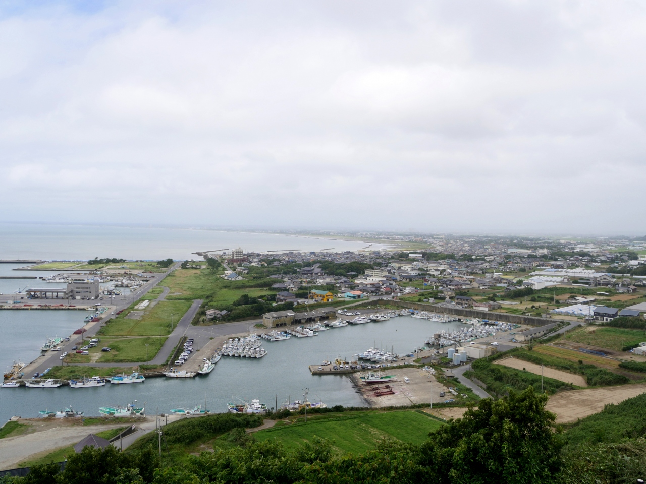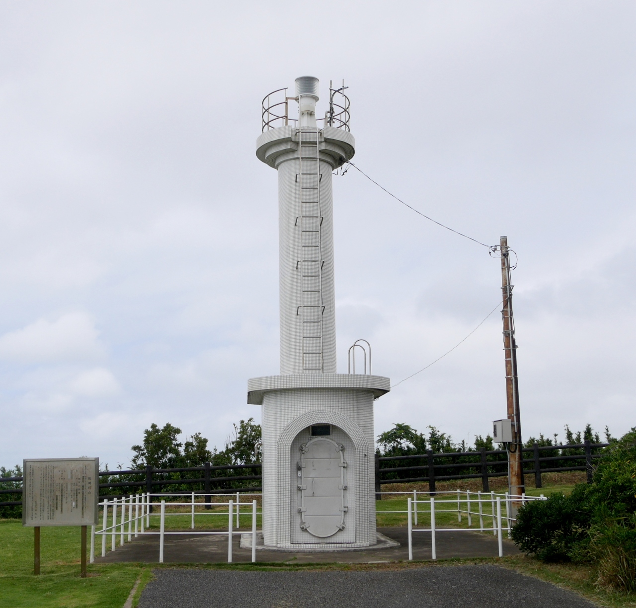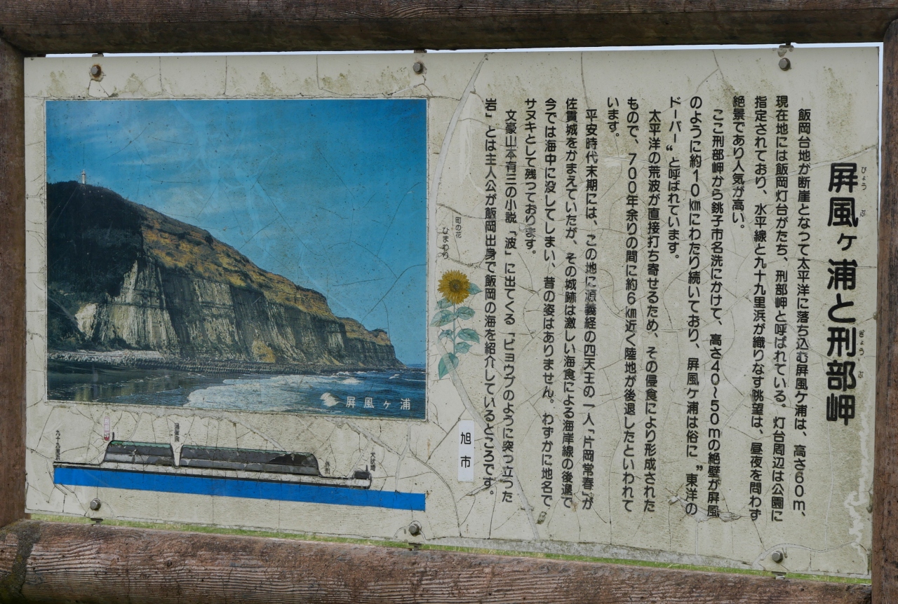 ここから銚子の古い地質に代わる そのため屏風ヶ浦の一番端になっている高台だ.飯岡刑部岬展望館~光と風に登る.九十九里の長い浜がよく見える.周りに風力発電も多い.刑部岬灯台は白亜のかわいい灯台だ.高さはわかるのだが,当然のことながら周りの崖のすごさはわからない