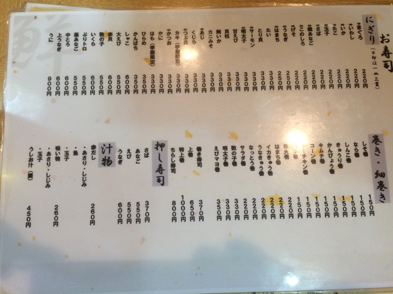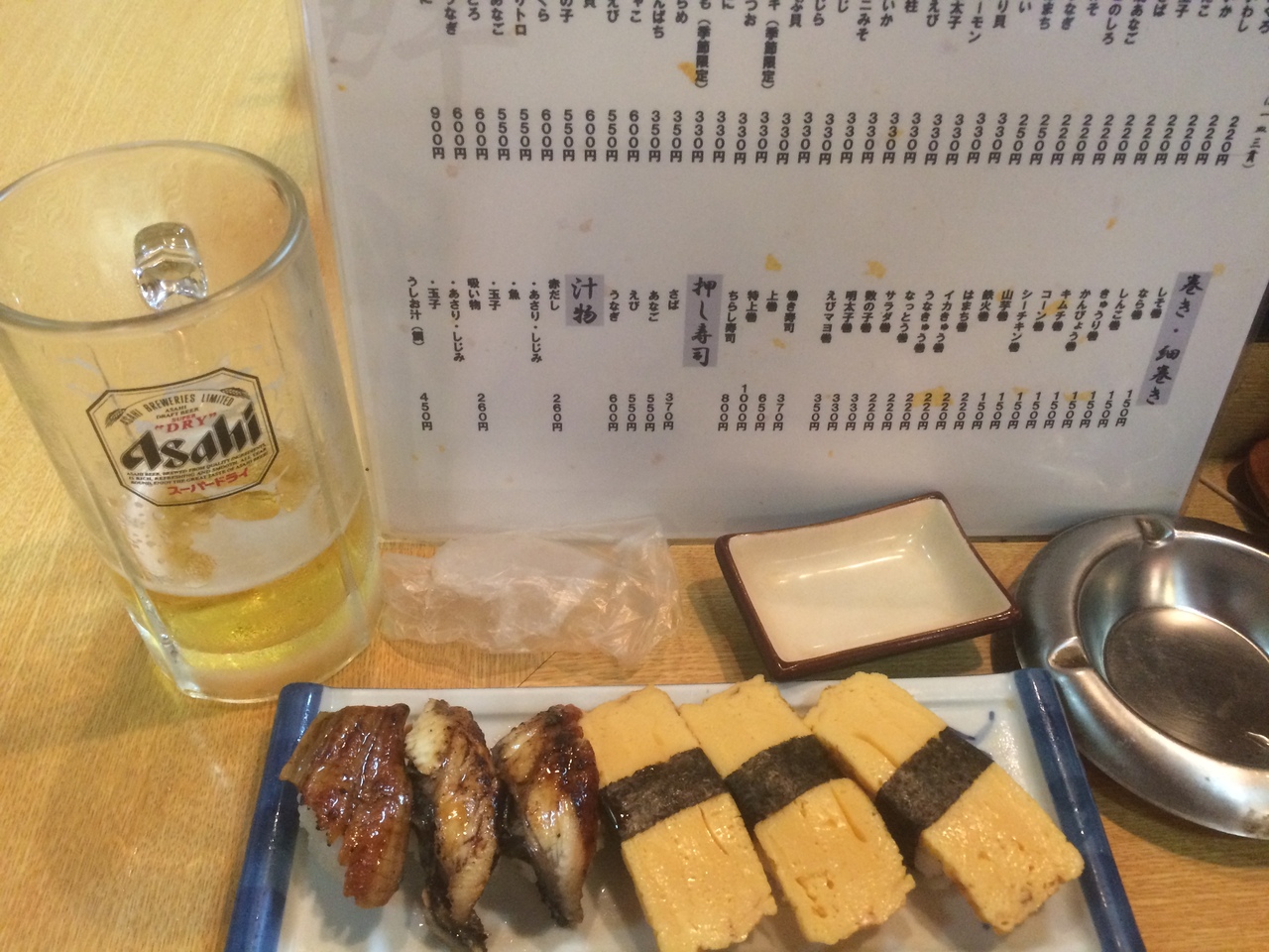 じゅんじゃん横丁の通り沿いにあり、同じ通りに本店もあります。カウンターのみの狭い店で、生ビールで喉を潤してから注文しました。一貫が3つでした。まぐろ、玉子、うなぎ等をガリと併せて食べました。夕暮れときに行ったせいかネタがあまり新鮮ではなかったです。
