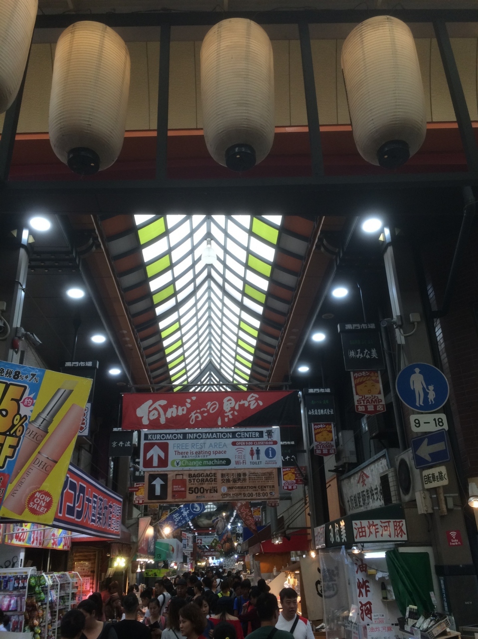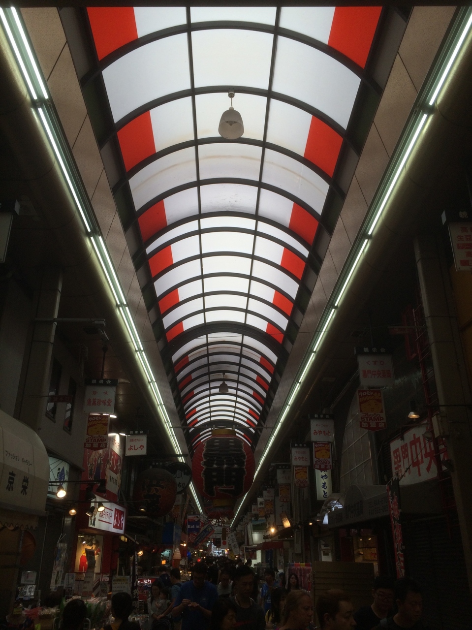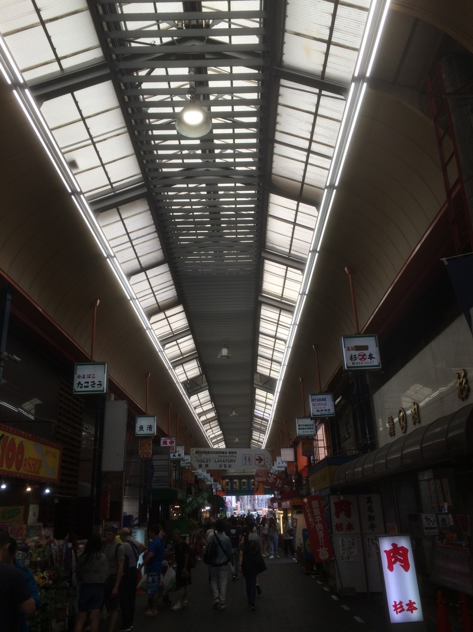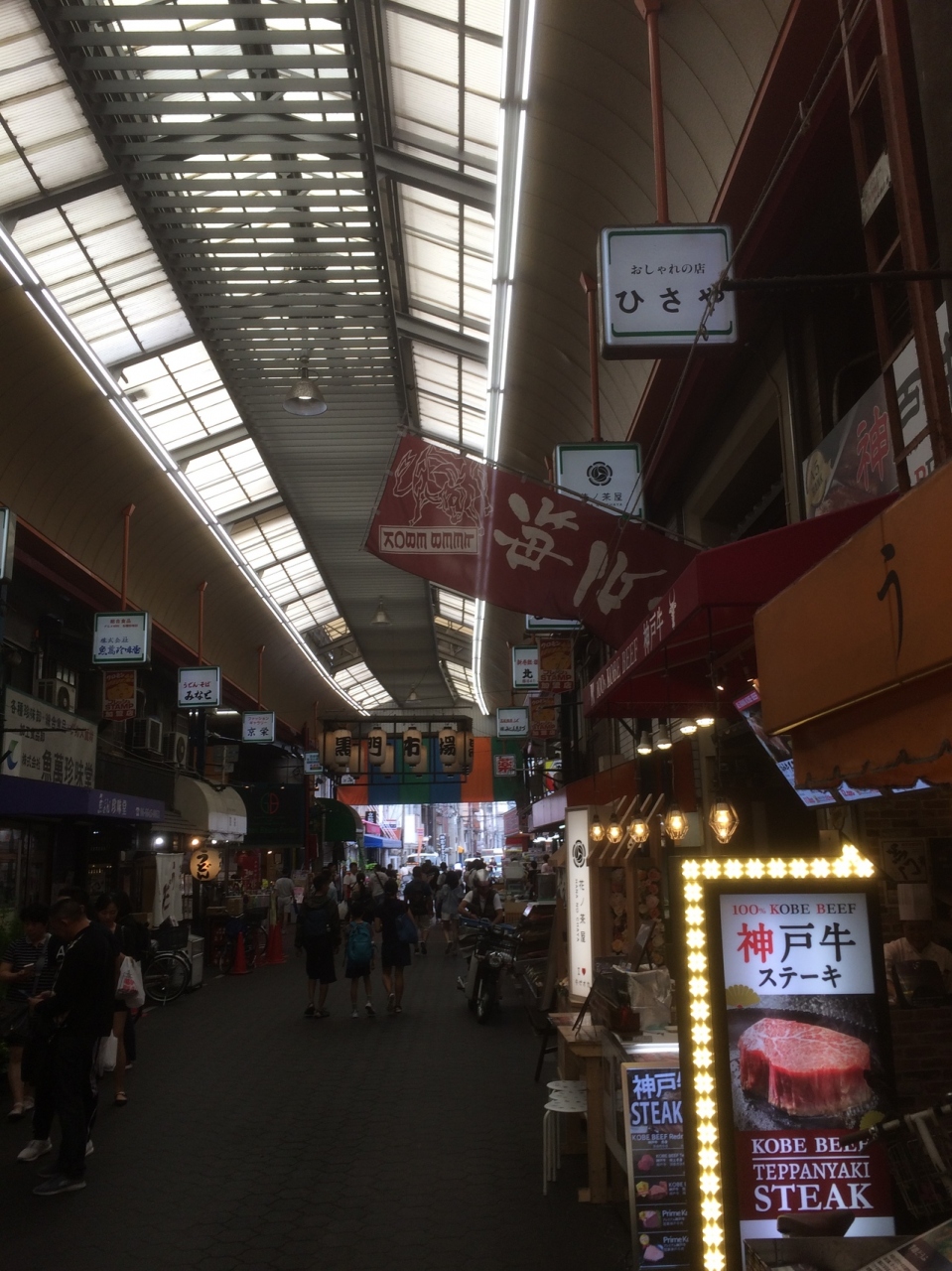 祝日の日中に行ったため人でごった返して歩くのにも苦労しました。歩いていると聞こえてくるのは中国語ばかりでした。アーケードがあり雨が降っても濡れなくてよいですが通りが狭いです。海鮮系の店が目立ちましたが、100円ショップ、スーパー、たこ焼き屋等もありました。
