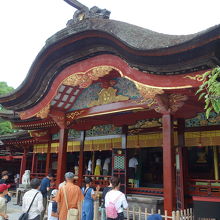 太宰府天満宮の御本殿は精細な彫刻が施されたド派手な建築です。1591年に再建されたものだそうですが、派手過ぎてあまり古さを感じさせません(笑)。茅葺屋根もまた日本の神社らしさです。