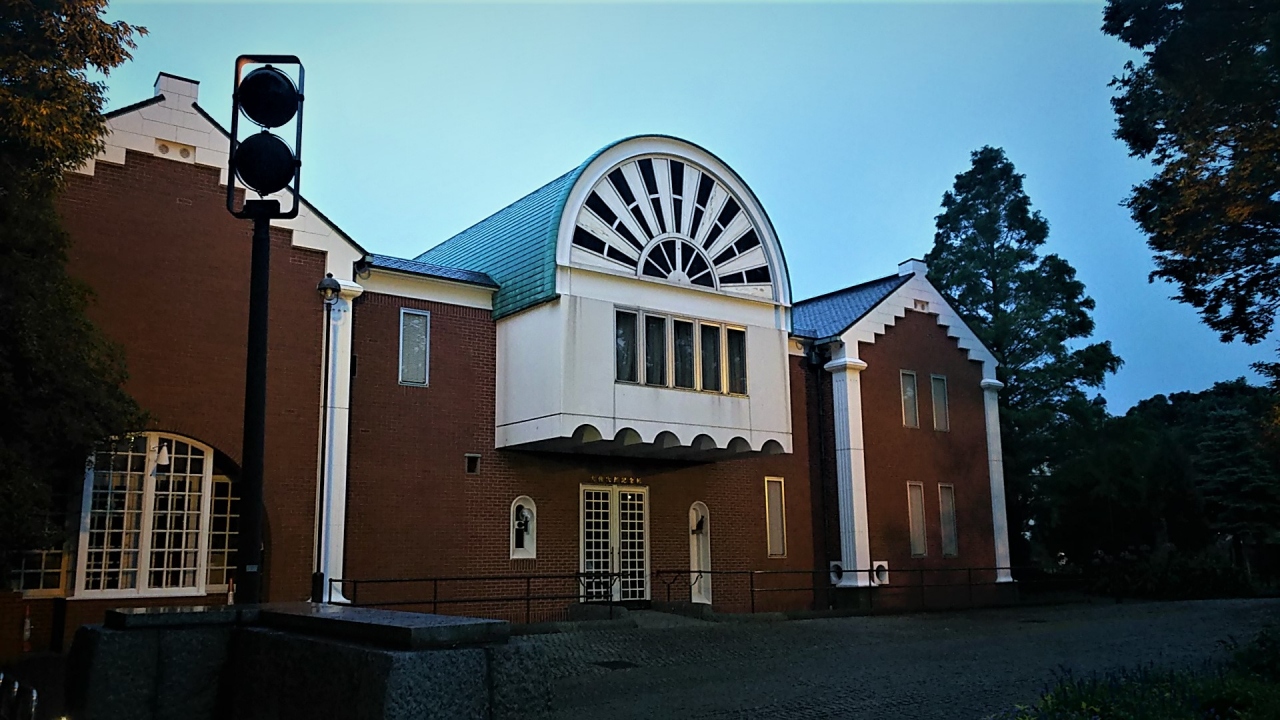 港の見える丘公園の奥にあるアーチ型の屋根と赤レンガ色の外観が一際目立つ館です。