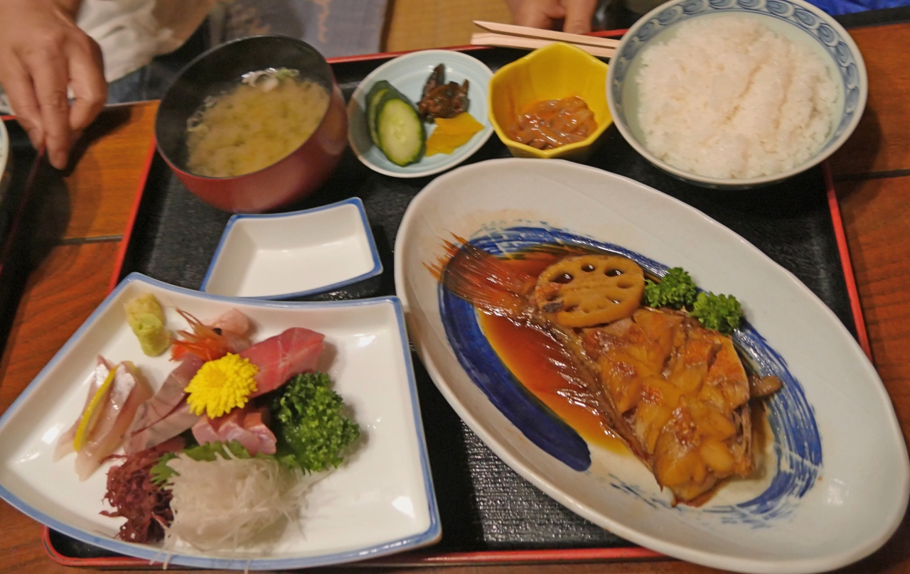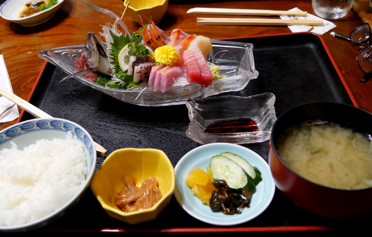 ボリューム満点で刺身も新鮮で,量も味も銚子らしく大満足.一緒に食べたカニサラダもお通しのいわしもおいしかった,が出てくるまでに時間がかかる.確かに若干込んではいたが,平日の昼間.定食が来たのが入店後56分後.時間がないのであわてて食べた.余裕を持って来店しないといけない店のようだ.