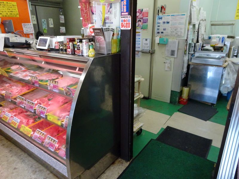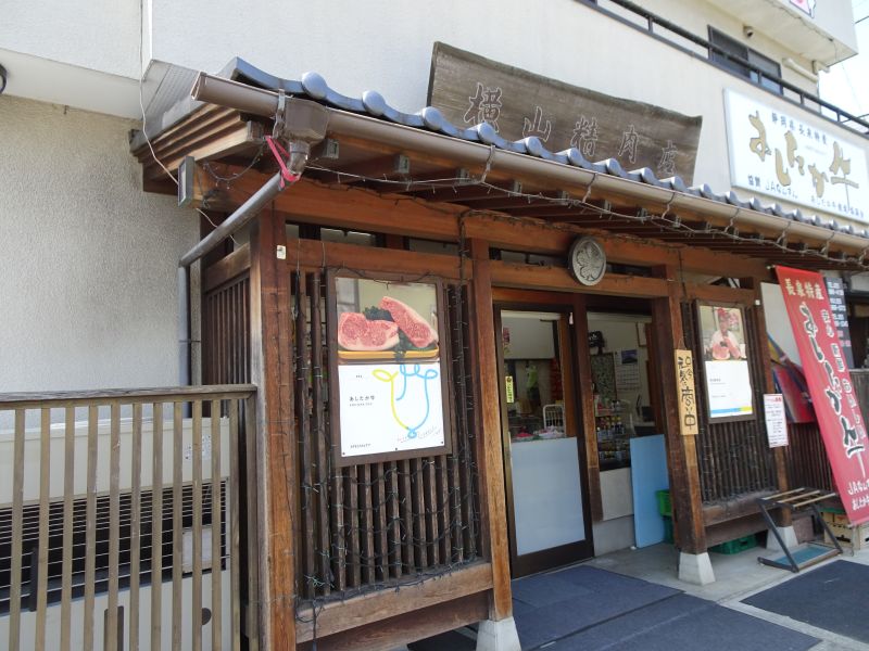 個人の精肉店です。店舗上の木彫りの「横山精肉店」が歴史を感じさせます。