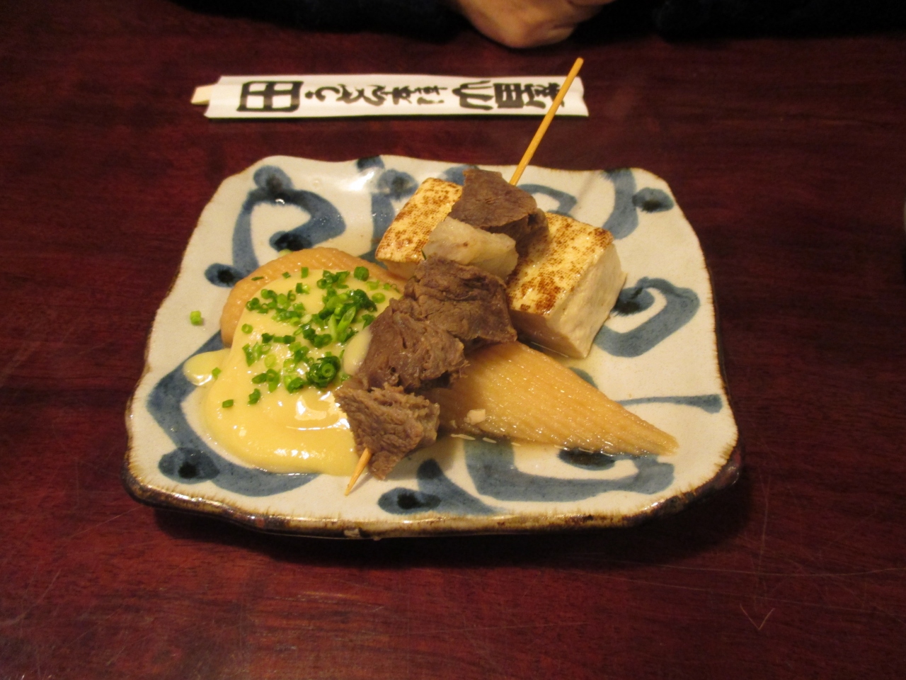 正月三が日とあって、広大な敷地にあちこちとある食事処がいずれも満席ということで、待ち席で庭を眺めながら、テーブルに着くまでに1時間以上も待ちました。個室風のテーブル席に案内され、待ってる間が寒かったせいもあり、先ずは酒とつまみのおでんをいただきました。