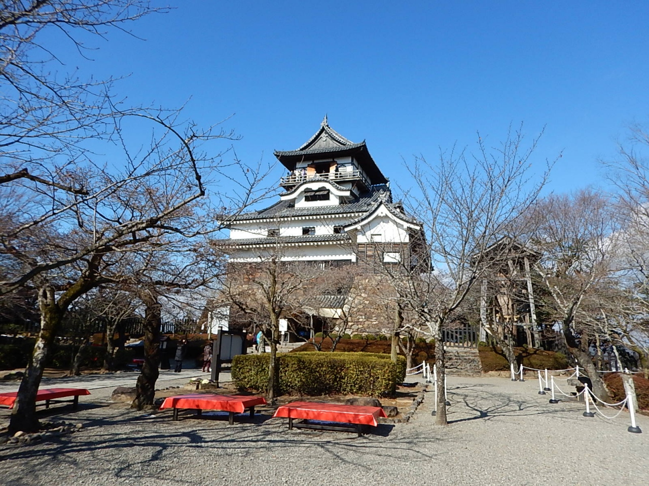 周囲には有料駐車場があるが、休日となるとかなり混雑する。三光稲荷神社や針鋼神社が隣接しているのでこれらの参拝もあわせて行う。門から天守閣まではすぐで、天守前の広場はそれほど広くはない。ただし現存する国宝の天守閣は数えるほどしかないので、とても貴重な場所である。天守内は急な階段を登って行く。途中階には文化財が展示されているが比較的少なかった気がする。