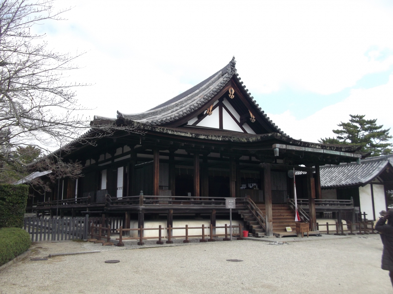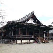 五重塔や金堂のある西院伽藍を出てすぐの、鏡池の前に建つ建物です。聖徳太子を祀るお堂で中央の厨子に祀られていますが、通常は閉じられていてお姿を見ることはできません。靴を脱いでお堂の中に入れば、お参りだけはすることはできます。