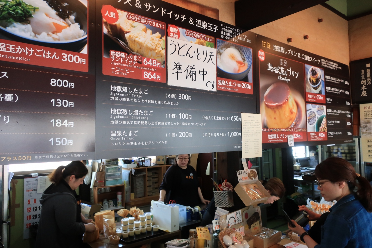 大型連休の最中。超人気店と聞いていたので大分市のホテルを早めに出発し、午前9時過ぎに到着した。が、すでに駐車場の残されたスペースは軽自動車用しかなかった。幸い、普通車用のスペースが空いたので駐車できたが、やはり出足が早い。帰途はガードマンが出てきており、長くできた駐車待ちの自動車の列をさばいていた。この日は家族3人で来店し、初めてのオーダーは地獄蒸しプリンと地獄蒸したまごサンドイッチ+コーヒーのセットだ。地獄蒸しプリンは冷たいプリンだけでなくタイミングよく蒸したての温かいプリンも注文できた。冷たいプリンは想像通りの味だったが、温かいプリンは甘味が立っており、新鮮だ。サンドイッチはゆで卵をスクランブルした卵ペーストで、温泉の噴気を見ながらたいらげた。