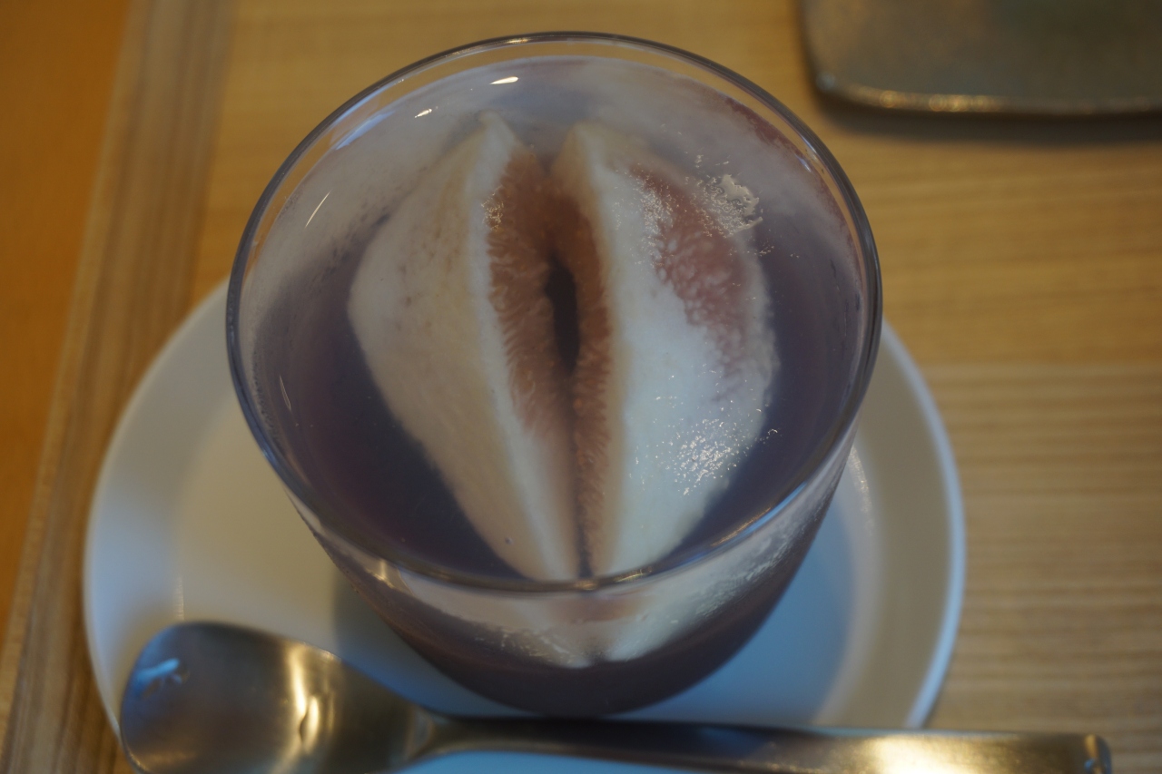 上半分をいちじくの実を寒天で包んだのが美しい水羊羹と抹茶のセットをいただきました。プルンプルンとほどよい柔らかさ。清涼感もあるし、なんでしょうねえ。凄味ということではないんですが、特別で上質なおいしさというのがあるように思います。