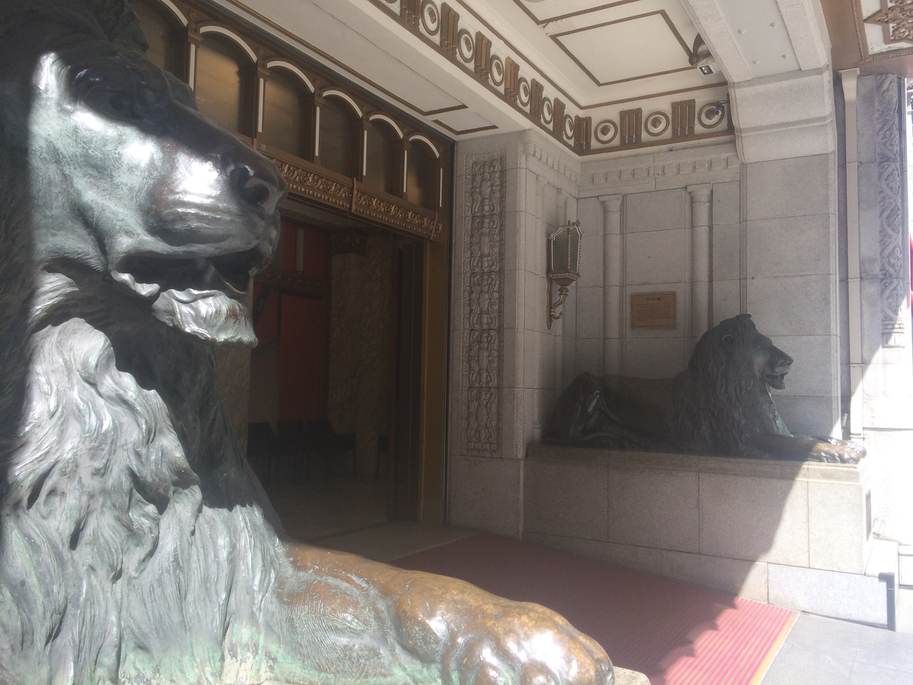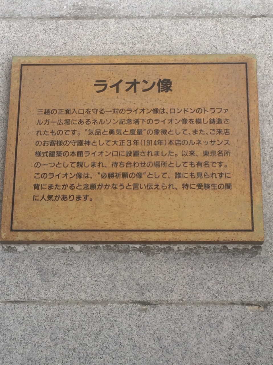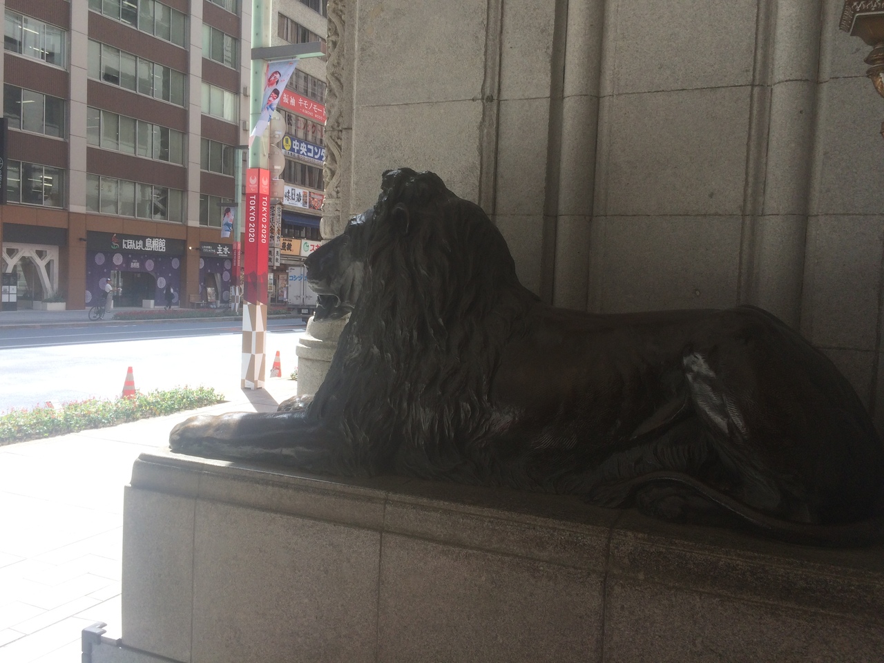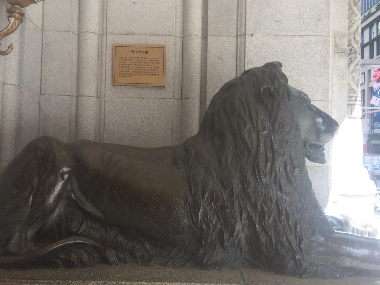 三越本店の出入口はいくつかありますが、その出入口の一つにライオン像が横たわっていました。頑丈そうなライオンで台座に座り正面を向いて、大きさも本物のライオン級の大きさで怖い顔をしていました。ロンドンのトラファルガー広場のライオン像を模したものらしいですが、迫力がある像でした。
