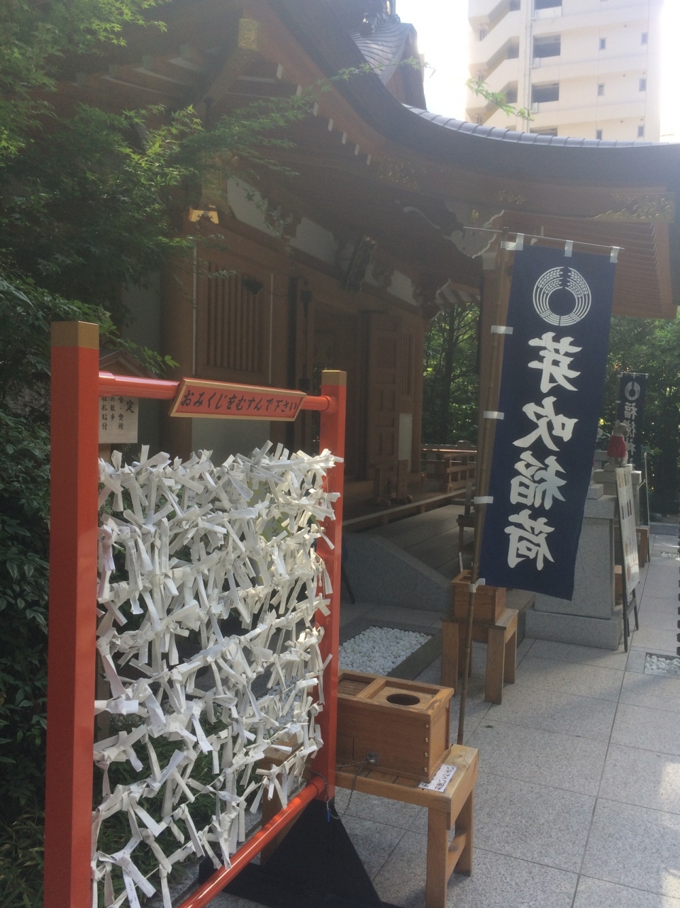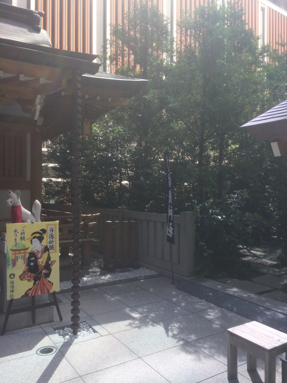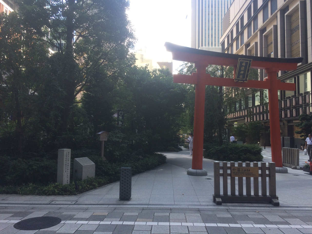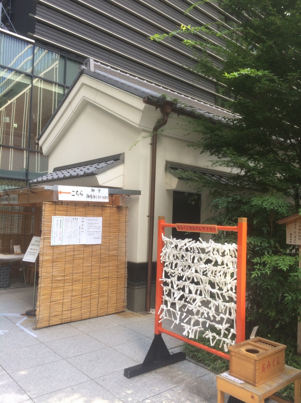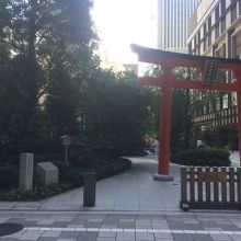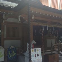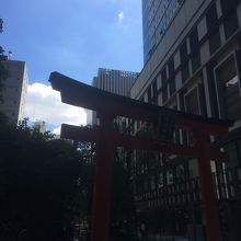 ご朱印やお守りを販売している社務所のような場所がトイレとくっついている建物でした、周りはビルだらけの場所に神社があるの心和む雰囲気となりました。鳥居が赤く、直ぐに社殿です。当選祈願と書いたもの置いてあり、宝くじにご利益がある神社なのでしょうか、都会にあるので参拝客が絶え間なかったです。周りに木々があるのも良いです。