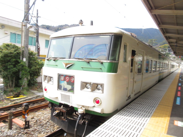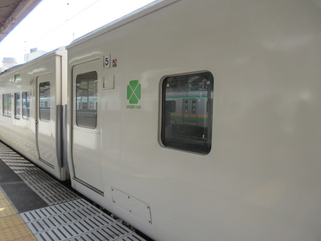 旅行で利用した電車です。今回はスーパービューではなく、ふつうの踊り子号でした。川端康成の「伊豆の踊子」からネーミングされているので、電車の先頭に踊り子の絵が描いてありました。白い車体に緑の線が入っています。指定席でしたので安心して背kに座れるし、旅行気分も上がりますよ。