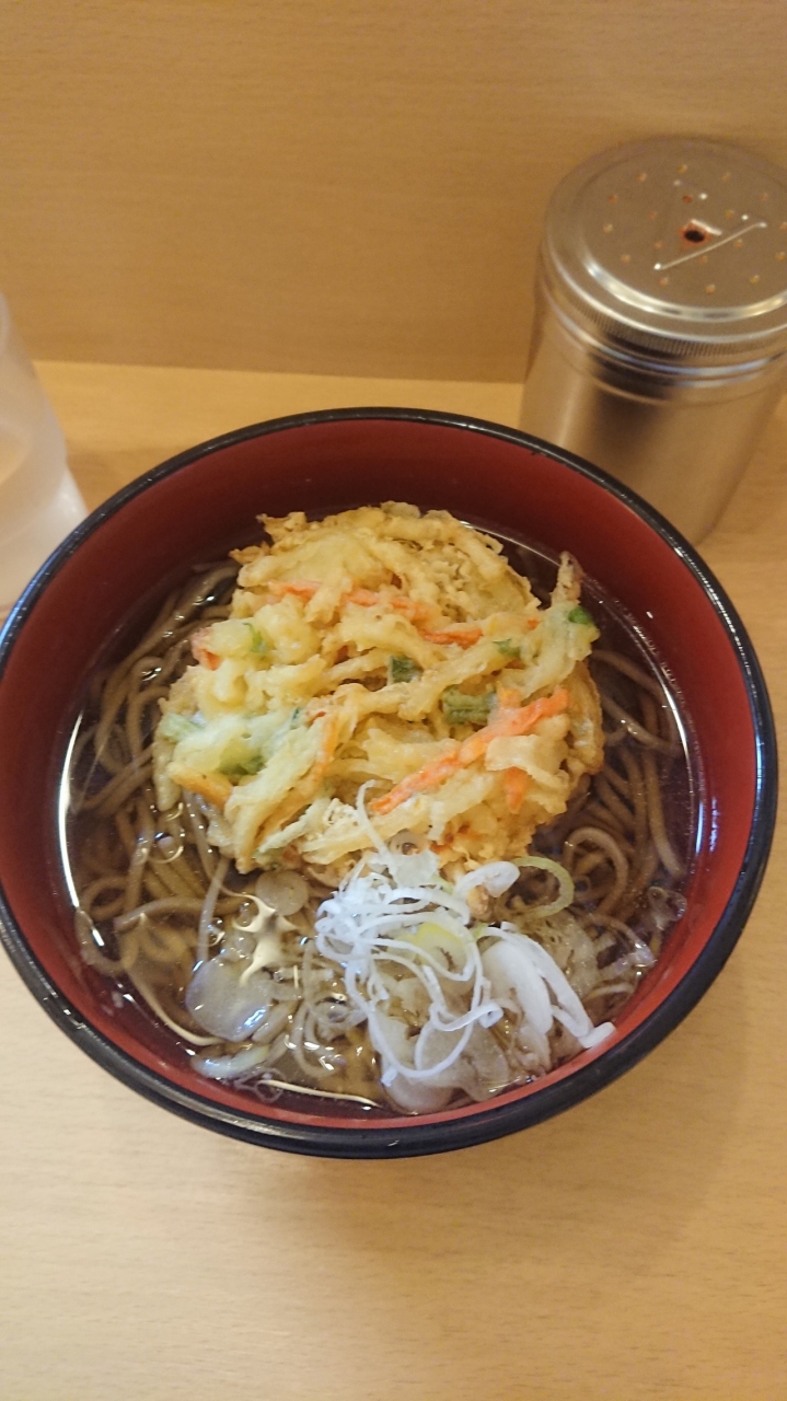 新青森駅で新幹線から在来線の乗り換えの合間にそばを頂きました。短時間でサクッと食事を済ますには、駅蕎麦が一番ということで、かき揚げそば400円をオーダー。リーズナブルですが、かき揚げの方は結構貧弱です。お蕎麦の方は、カウンターの目の前にビニールに入った一玉数十円でスーパーに売ってそうなやつが茹でられてました。かなり小麦粉多めの蕎麦のようで、あまり蕎麦の味は感じられず。値段相応です。