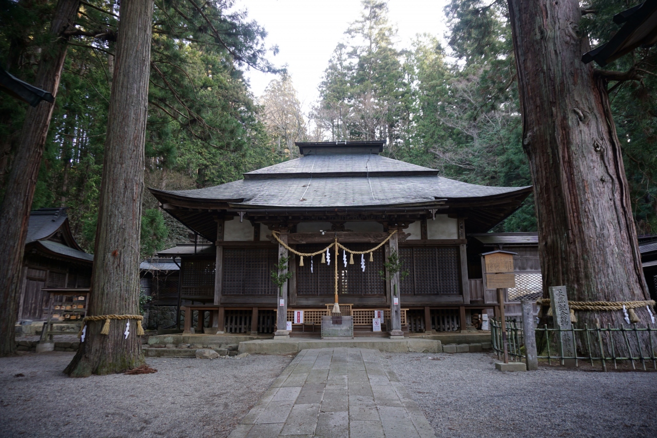 始まりは、1141年(永治元年)。飛騨国国司の平時輔が、近江国日吉神社を勧請して創建しました。鳥居から山の斜面を上がっていく参道はそれなりに長く続いて、けっこうな構え。本殿の屋根の形が裳階みたいで独特かなと思いました。
