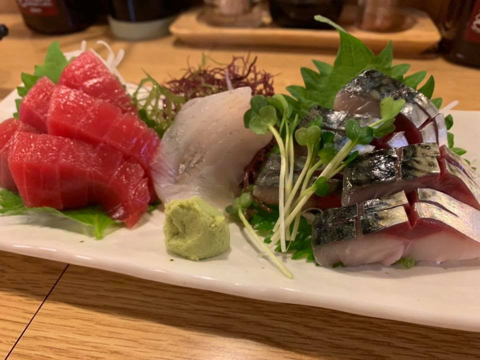 今回は、お造り3点盛り・冷製トマト・つくね・鶏かわ・なっとう巾着揚げを注文。