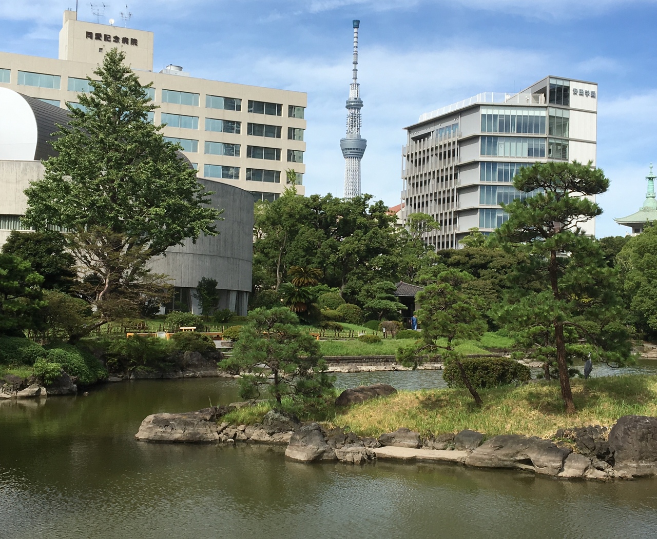 大きな石灯籠があり、池には太鼓橋が架かっています。鯉や水鳥もいます。水辺で涼んでいたら、水面にカメがやってきました。人に慣れているようです。視線が合いました。のんびりすれば、と言ってくれたのでしょうか。