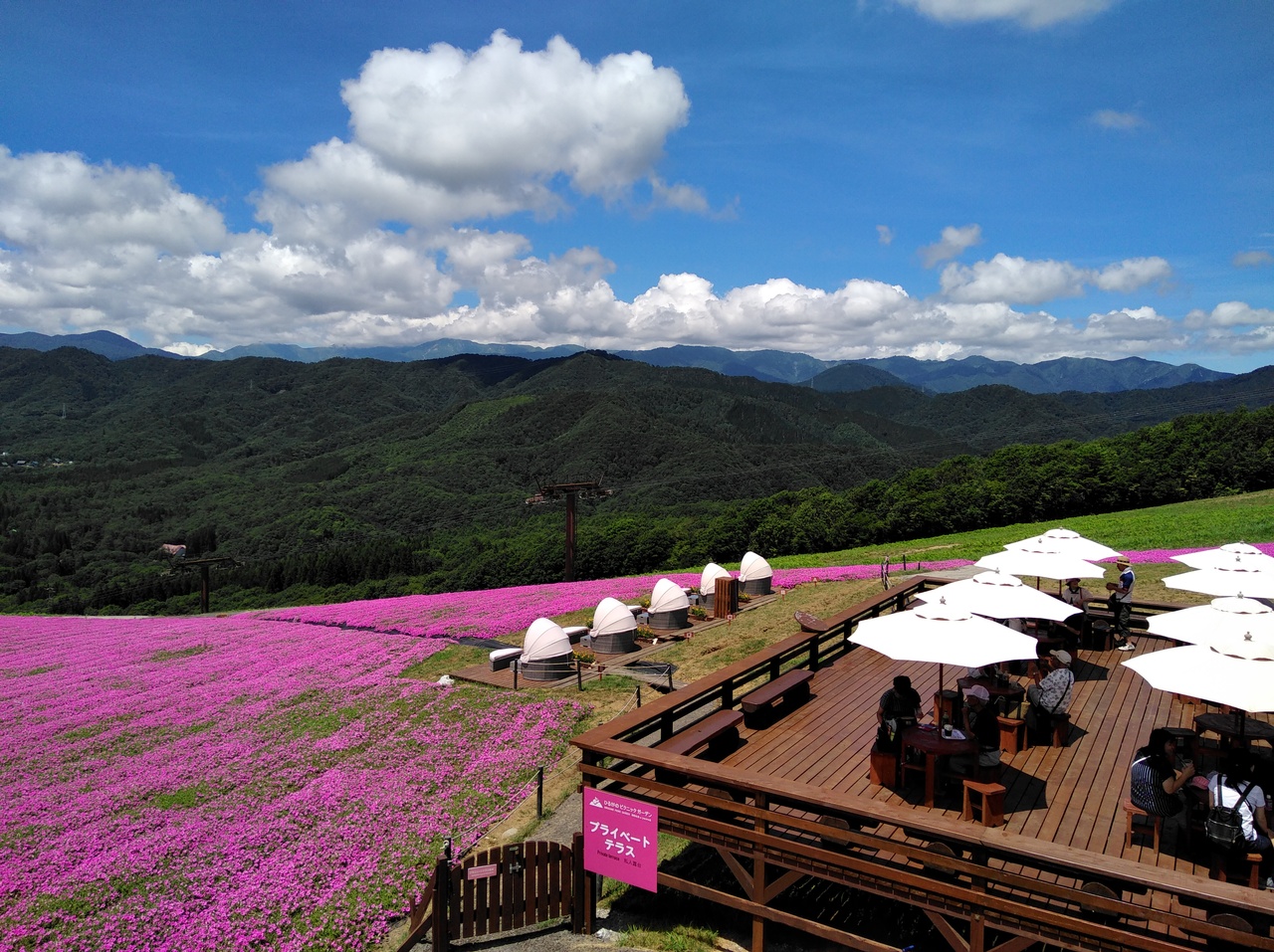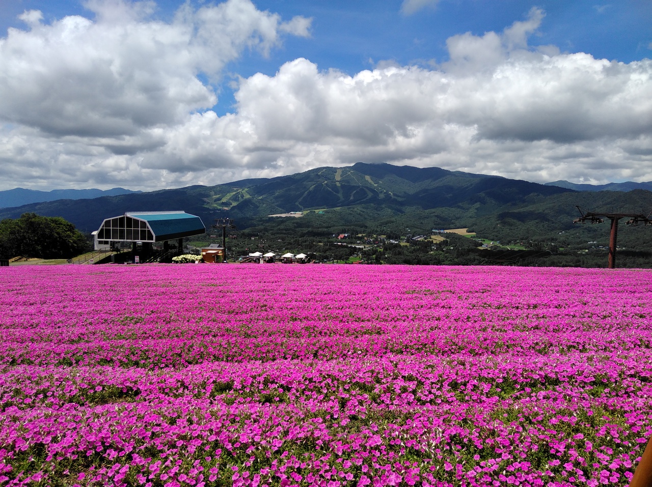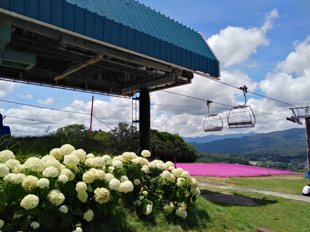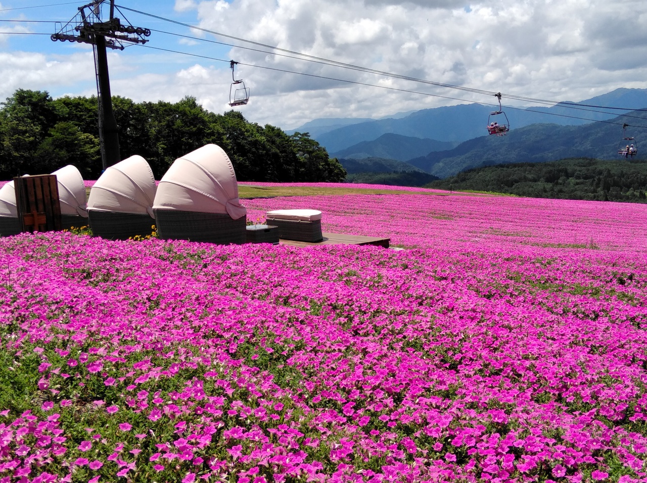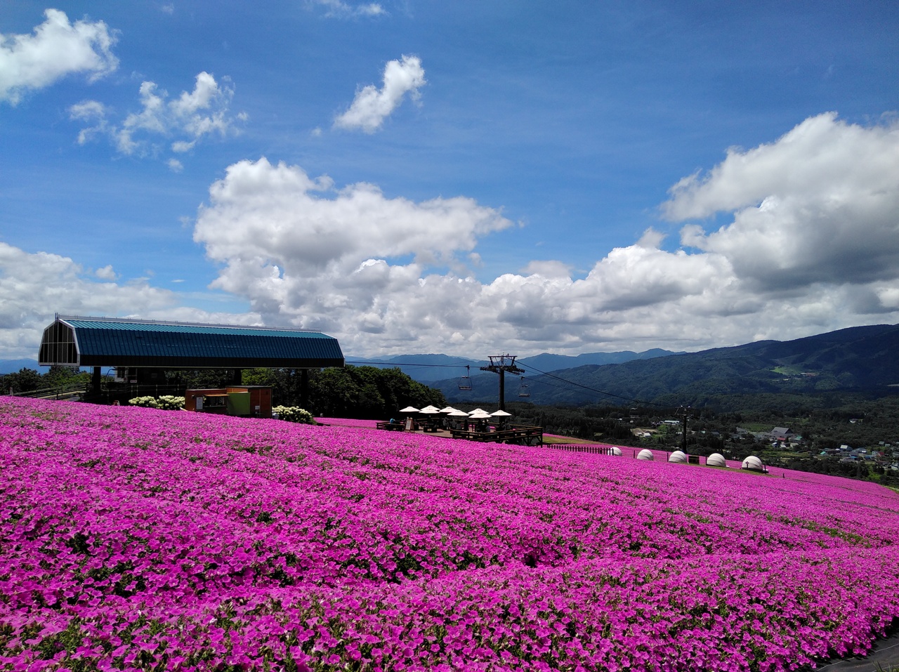 ペチュニアの花が山頂に咲き誇り、暑い日ですが山頂は心地良い風があり気分爽快。平日で混雑もありません。入園料大人500円往復のリフトが800円。