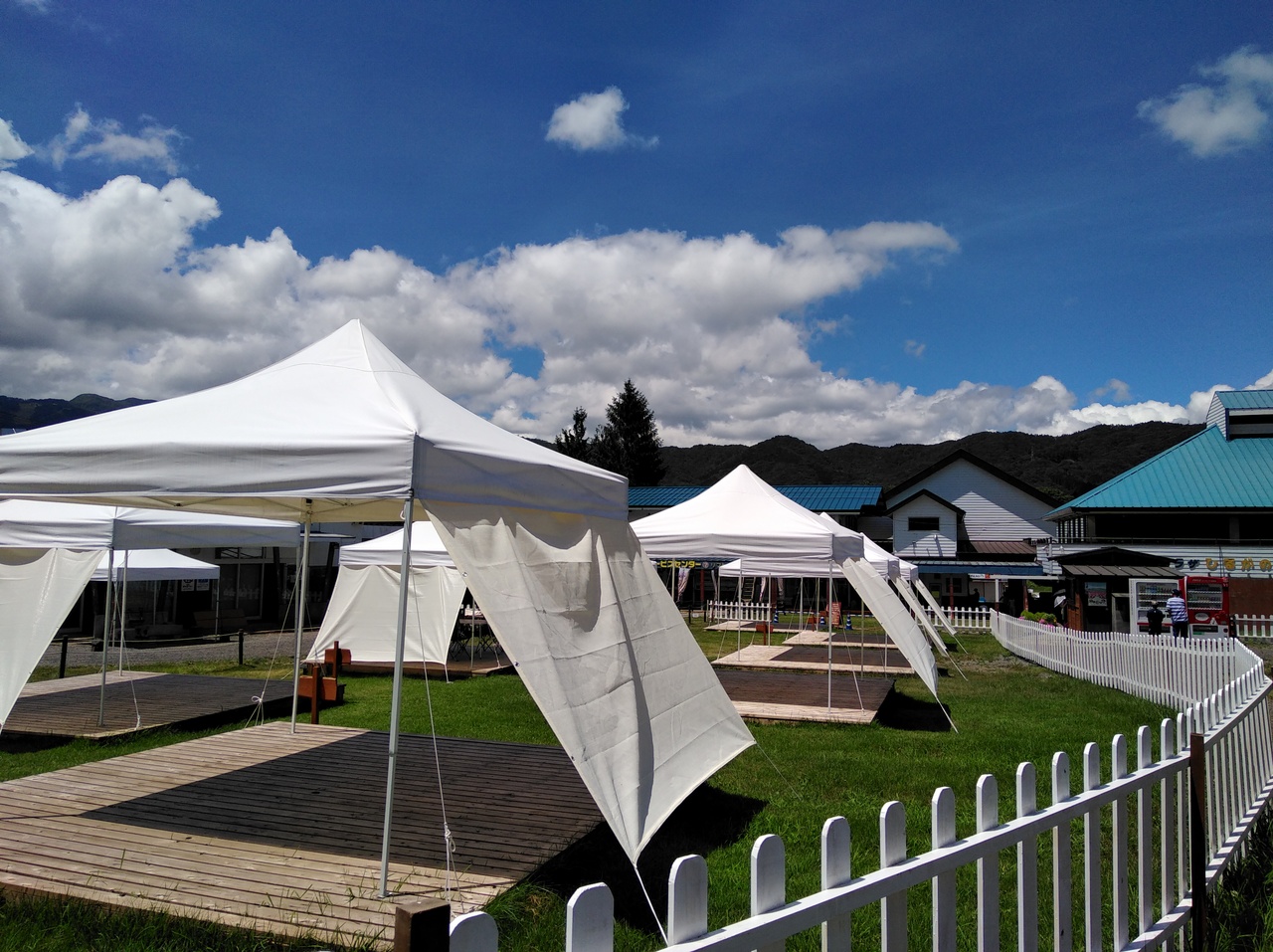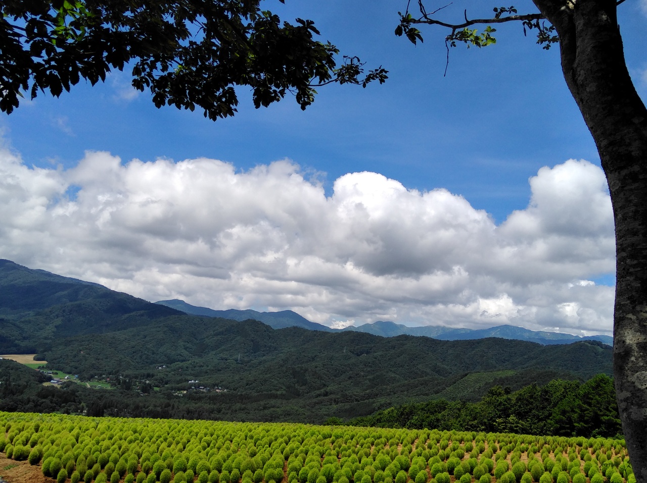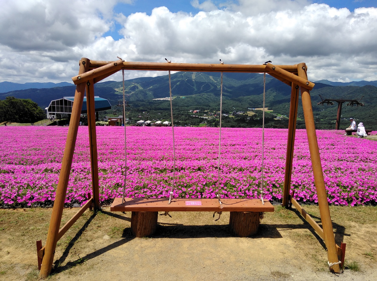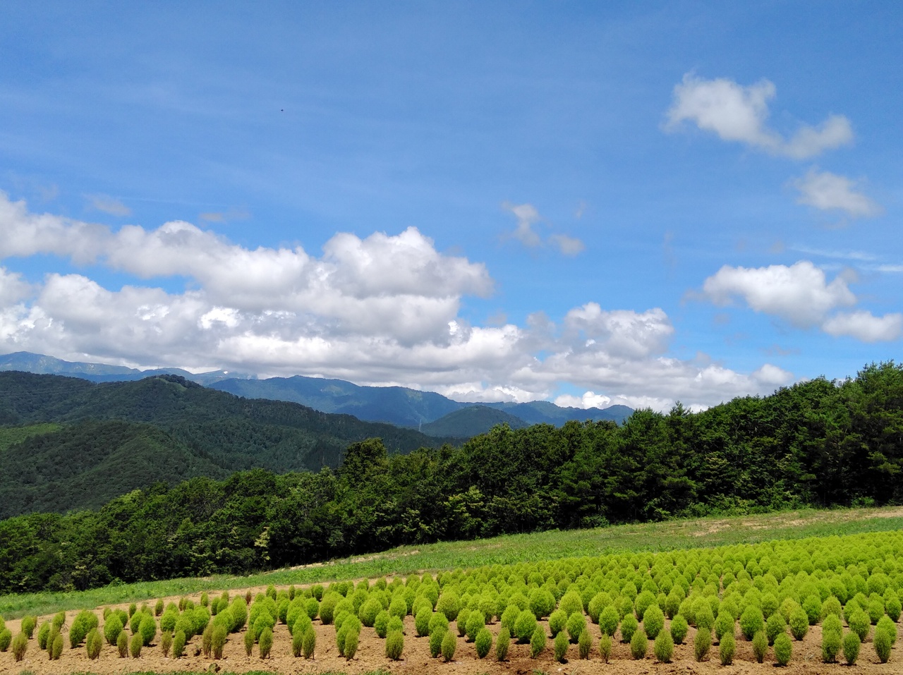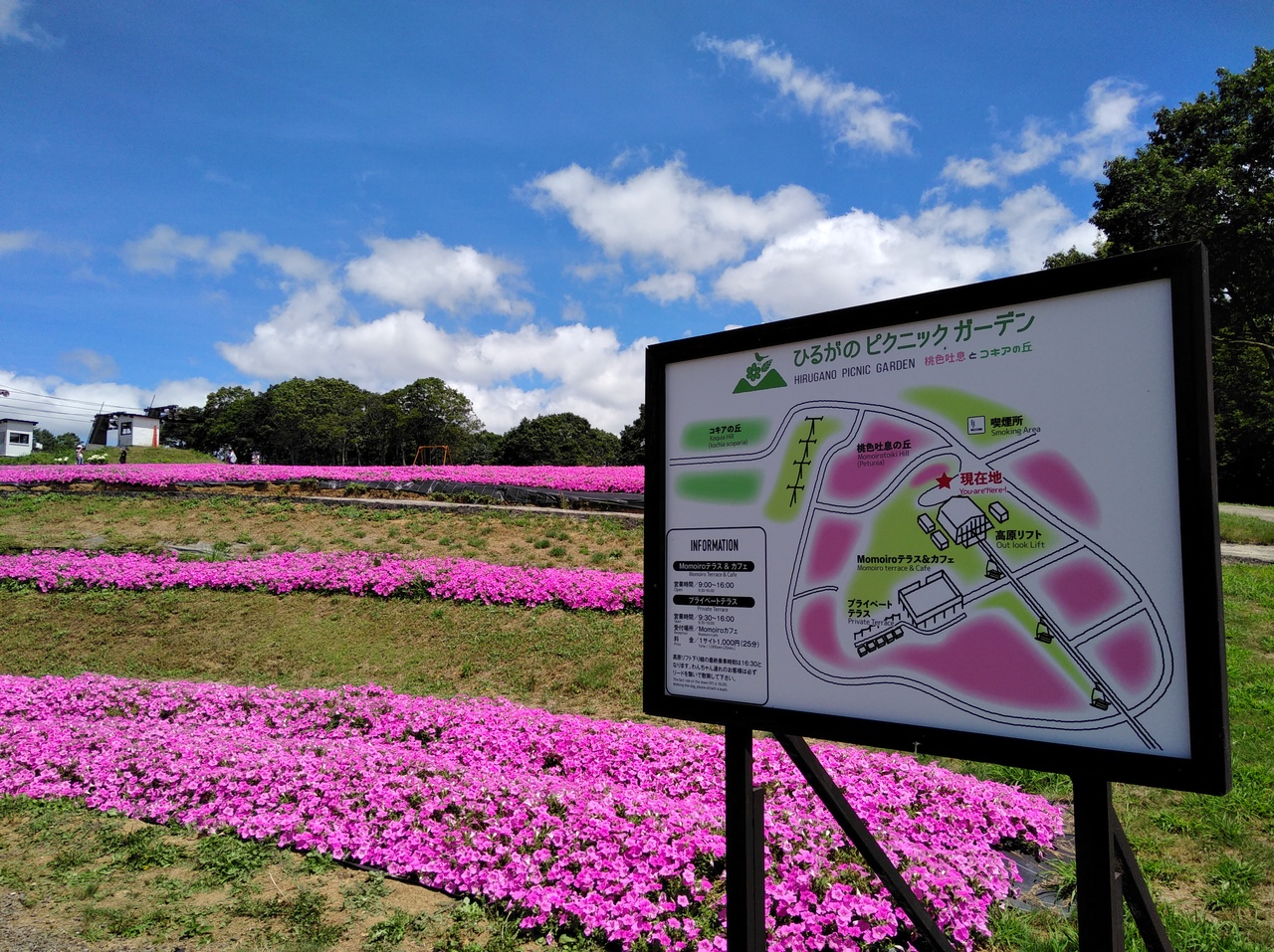 ペチュニアの他に1万株のコキアも植えてあり、綺麗なグリーンが見られます。山頂では景色を楽しみ、それ以外にディスクゴルフ、