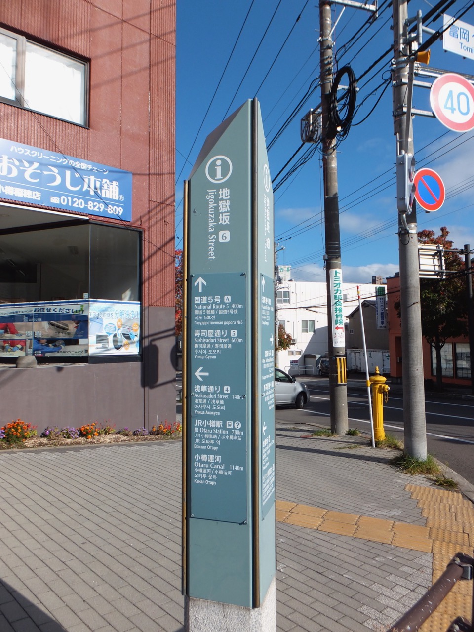 小樽商科大学までまっすぐ登る長い坂です。小樽の他の坂、例えば船見坂に比べると自動車が多く走る普通の道路であることからあまり急勾配でもないですが、どこまでも続く長い坂なので実際に全部登れば見れる分いやになるでしょう。今回は気候のいい秋ですし、富岡教会までなので地獄は見ていません。船見坂と違って簡単な標識柱があるだけでした。