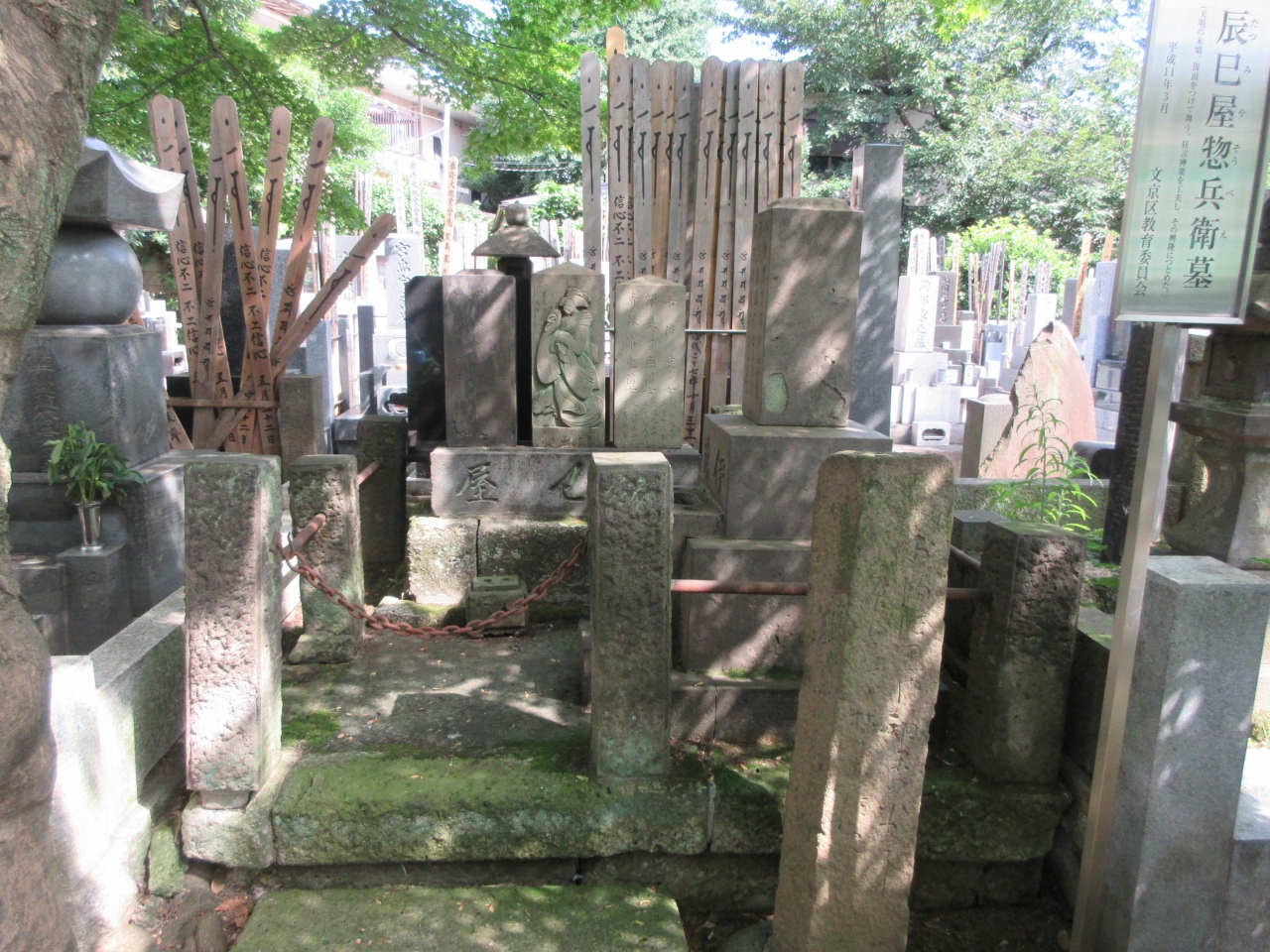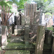 吹上坂沿いに建つ善仁寺の裏にある慈照院の境内に眠っています。江戸時代の遊侠人で、狂言神楽を創案した人物で、踊りに女装を取り入れたり、仮面をつけた踊りを生み出したりして人気を博したそうです。江戸市内の神社や大名邸で舞を披露したとのことです。墓は山門を入って左側、枝垂桜の下にある井戸の前に建っています。墓石には舞を演じている姿が描かれています。江戸時代の文化を知ることができました。