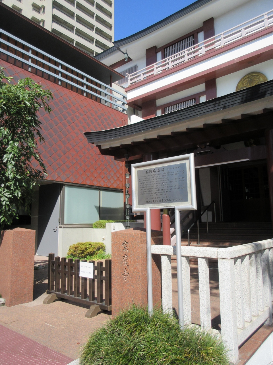 桜並木で知られる播磨坂となりの吹上坂の途中に建つ宗慶寺に残っています。寺の入口には説明板があり、徳川家康の側室として六男・忠輝の生母だった茶阿局の墓碑である宝篋印塔が残っていると書かれていました。本堂階段の左側に置かれているようでしたが、寺の中に入れる雰囲気ではなかったので、近くで見ることができませんでした。伝通院に残る徳川家ゆかりの墓に比べ、ずいぶん小さなものだと感じました。